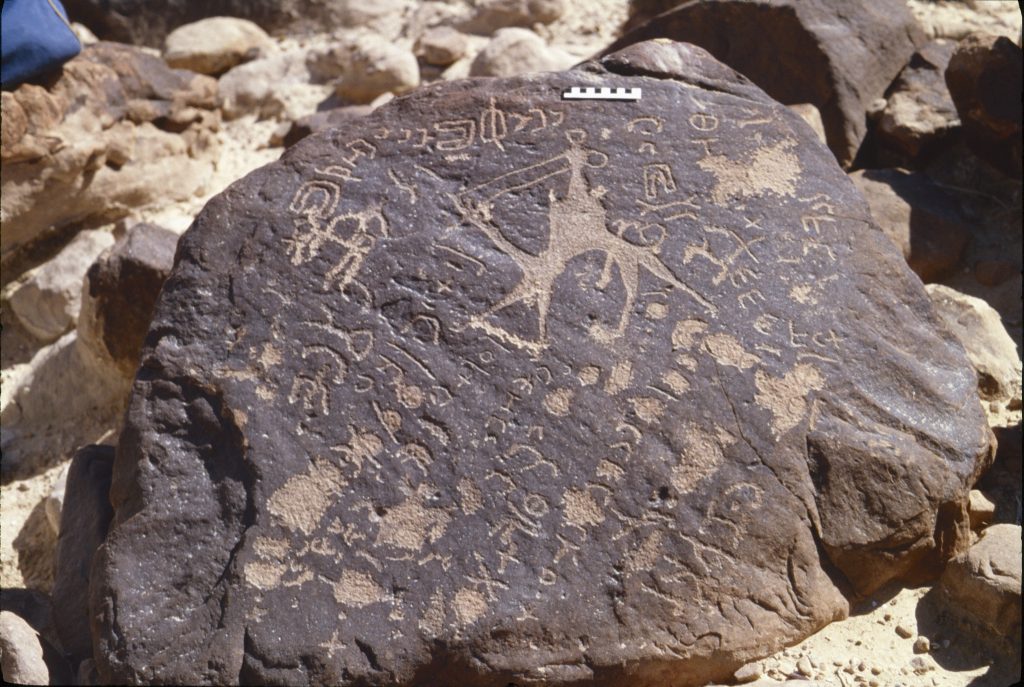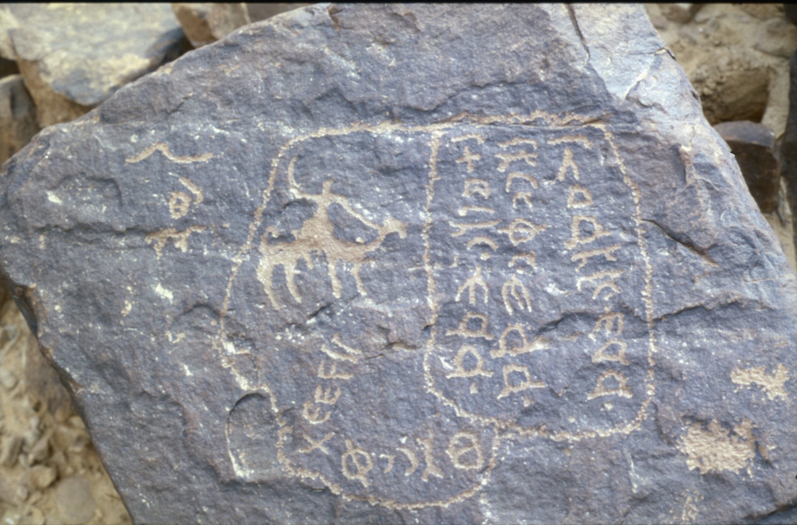 An excellent drawing of a camel and rider surrounded by more than a dozen Thamudic inscriptions that the AMAES recorded in Wadi Hafir. Photo by Michael Bannigan.