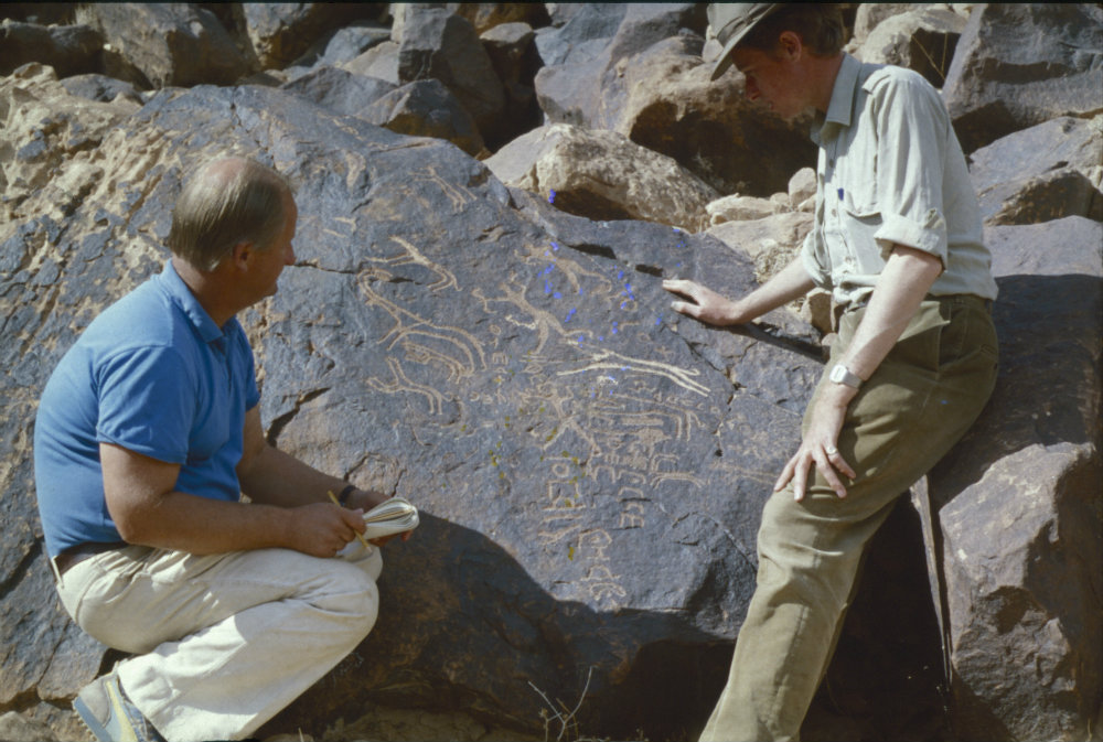 Bill Jobling (left) and project assistant Richard Morgan (right) study a boulder carved with an elaborate hunting scene and Thamudic inscriptions. Photo courtesy of AMAES.
