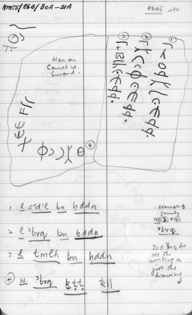- William Jobling’s fieldbooks: contain preliminary on-site transcriptions/readings/translations of inscriptions, as well as miscellaneous notes on landscape, features, and progress of survey