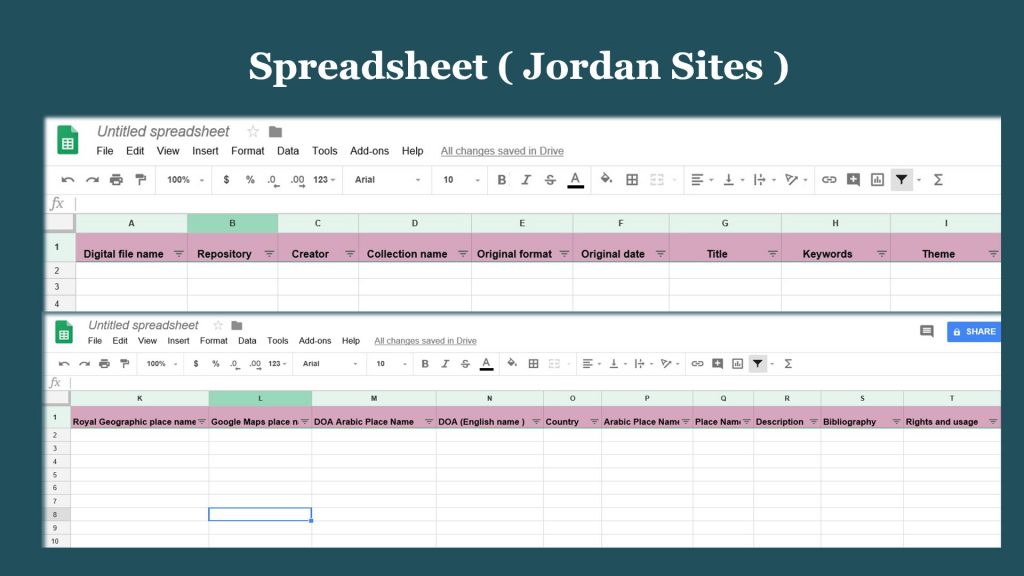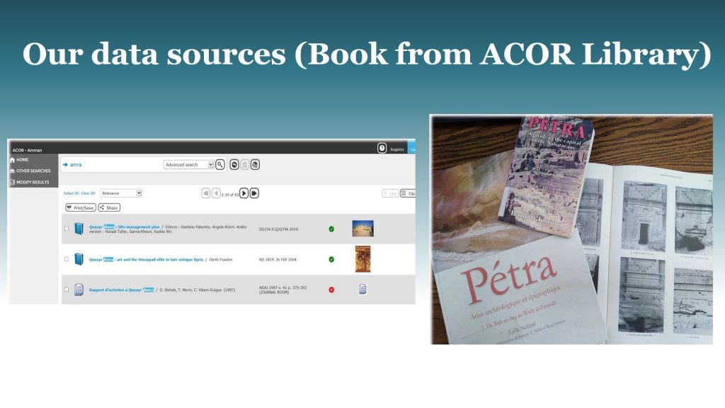 من خلال مشروع الأرشفة الالكترونية الذي نعمل به في أكور والمتخصص في ارشفة الصور المتعلقة بالمواقع الأثرية والتاريخية في جميع مناطق الاردن وعدد من الدول المجاورة كمصر، سوريا، العراق، اليمن، السعودية، باكستان و تركيا، فإننا نقوم بإدخال البيانات في جداول خاصة تتضمن على عدد من الحقول كالعنوان، تاريخ الانشاء، المسؤولية، كلمات مفتاحية، انواع الافلام المستخدمة، وصف تفصيلي، حقوق الملكية، اسم الموقع وهنا اقف قليلا لشرح طريقة البحث عن اسم الموقع من خلال الاعتماد على عدد من الفهارس كفهرس دائرة الآثار العامة لأسماء المواقع واستخدام موقع الميجا جوردن، فهرس المركز الجغرافي الاردني، مكتبة الكونغرس الامريكية و موقع خرائط غوغل، فقد كان السبب من وراء البحث الدقيق لأسماء المواقع بأن المواقع الاثرية في الاردن لها عدة طرق للكتابة بإختلاف مصدرها او الشخص الذي وثقها وبالتالي كان لابد من ادخال كل الاسماء التابعه لاي موقع بأشكله المتعددة لتسهل على الباحث الحصول عليه
