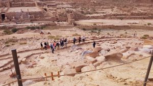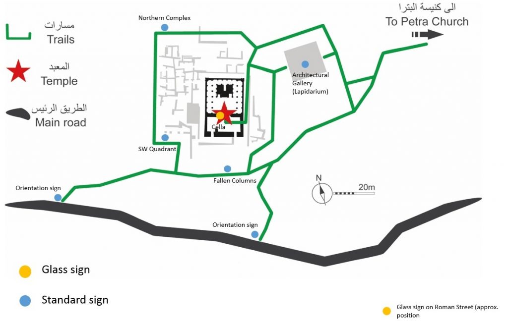 In Spring 2018, a series of new signs were installed to mark the end of our main program of site improvements through the SCHEP project. This included a second glass sign down on the Colonnaded Street, some distance from the site at a much lower level. It allows visitors to see the two story temple dramatically emerging from the hillside and further builds awareness of TWL for those passing through the “main drag” of Petra. The glass signage is still a pilot project, and it is unclear how long they will last. The first glass sign in the Cella was sadly damaged, though subsequently replaced thanks to AFCP support.