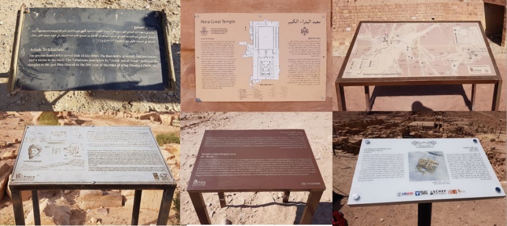 Another challenge for the signage design at the Temple of the Winged Lions is the plethora of diverse materials and styles already in use across Petra. For example, the Petra National Trust (PNT) installed a number of metal signs around two decades ago, some of which are still in use today. Durable wall-mounted metal signs, produced by Brown University, can be seen at the Great Temple in Petra. Signs made from printed ceramic tiles, produced during the USAID Siyaha project (2005–2008) have survived at some locations, with the fullest set extant at the Petra Church. Engraved aluminum signs produced through UNDP (2015–2016) may last longer but are expensive. A number of UNDP signs were substituted in 2018 with metal signs sponsored by Hyundai.