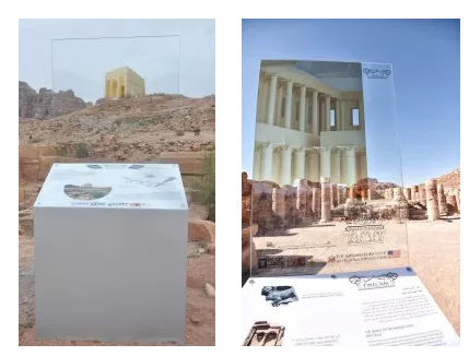 So what about more dynamic ways to help interpret sites? Augmented Reality (AR) is a concept often discussed in terms of digital applications of visual content that can be used to overlay or interact with a real world environment and has been employed in heritage tourism settings. Just one example is the Römerstadt Carnuntum app. Such digital tools may well be employed at Petra in the future, yet it is noted that simple analog methods can also be effective. For example, at Heidentor, the ruined city gate at the entrance of Roman Carnuntum in Austria there is an AR glass sign with a reconstruction drawing lining up with the ancient ruins, allowing visitors to visualize this partially preserved structure. This formed the inspiration for an AR glass sign at TWL developed by Elena Ronza, Qais Tweissi, and Jehad Haron and produced by the Modern Advertising Center signage company in Amman under the direction of then ACOR Associate Director, Glenn Corbett. The sign, installed in 2017 as a follow up to a 2013 pilot project to partially restore the temple with faux column capitals (see ACOR Newsletter 25.2) presents a visualization of the inner sanctum of TWL along with imagery of a winged lion column capital. This provides visitors with a way to interpret the architectural space as an interplay between past and present, allowing them to see what is preserved and what was once present.
