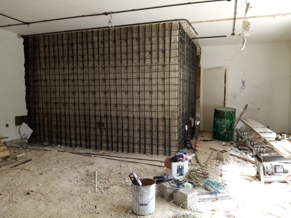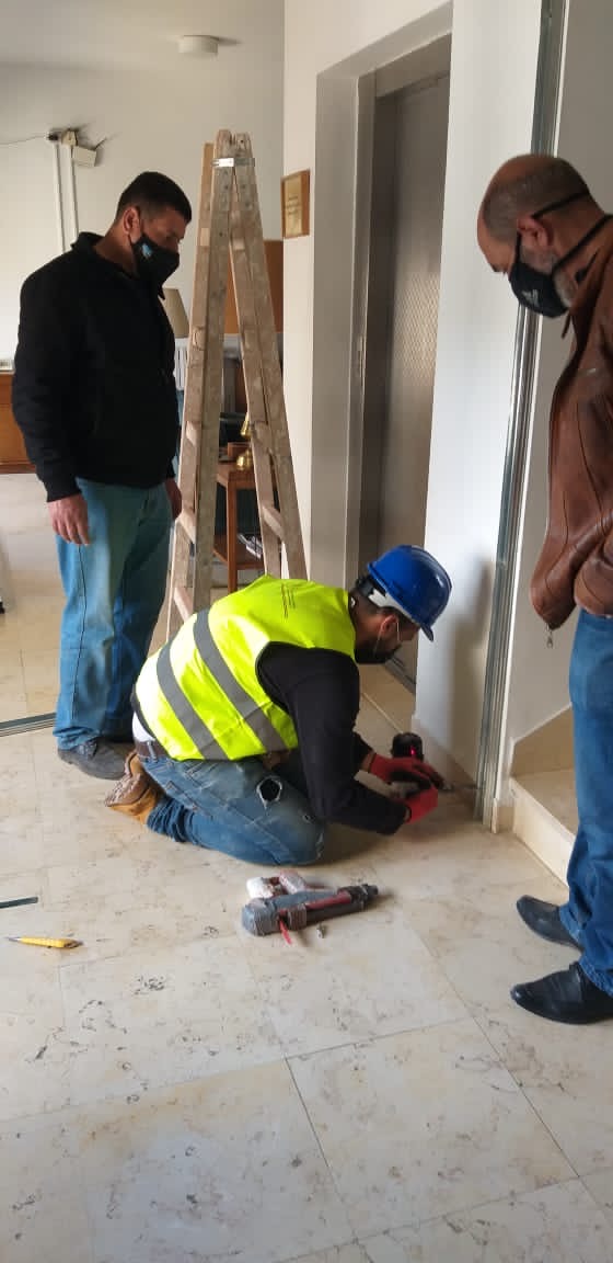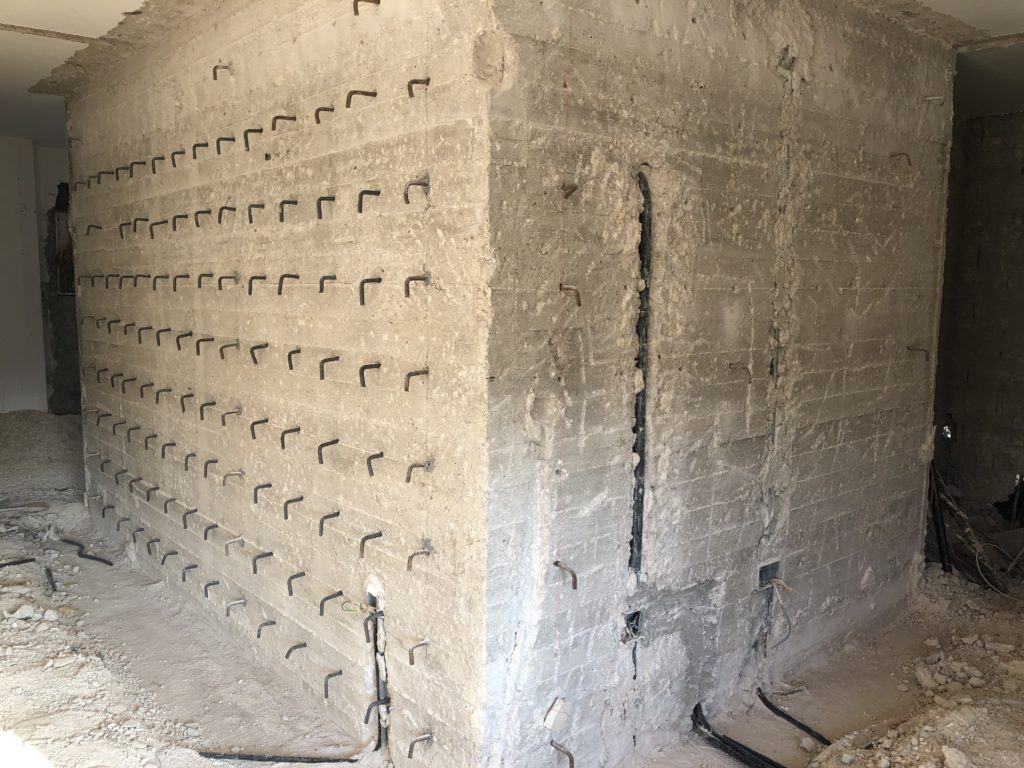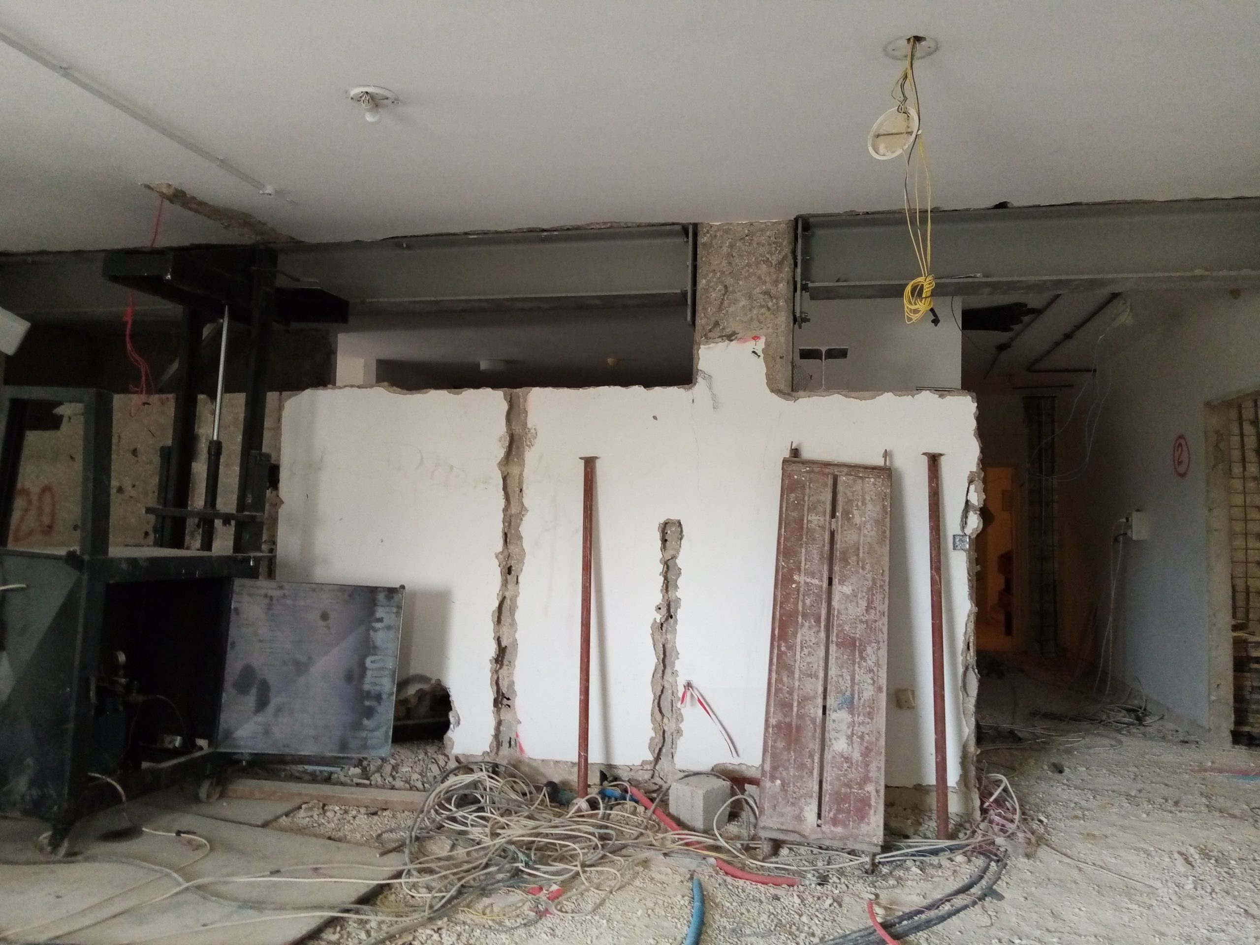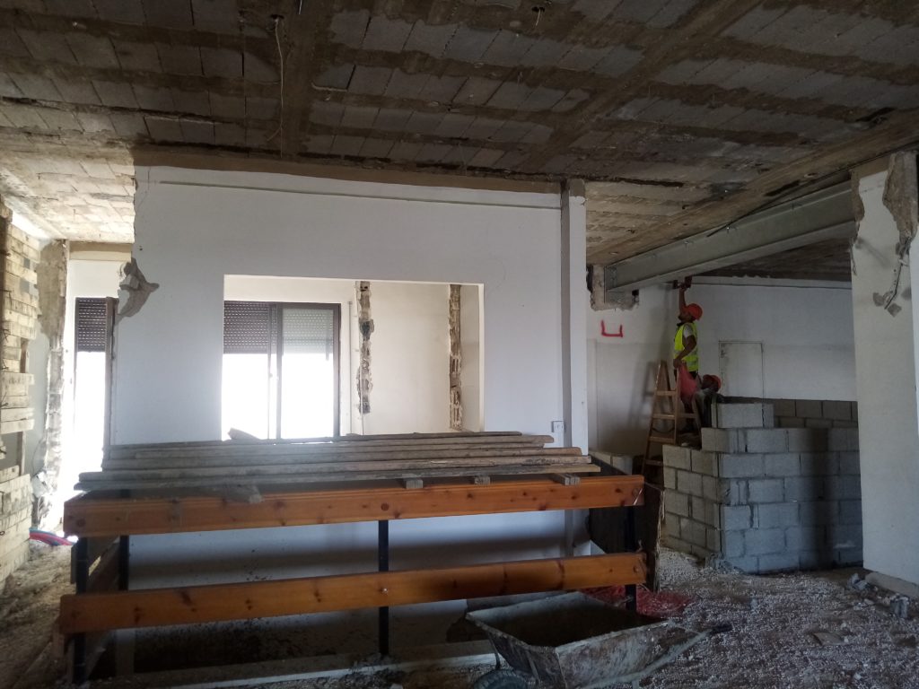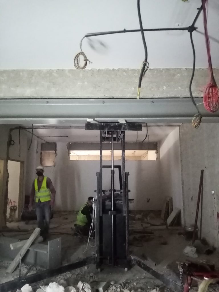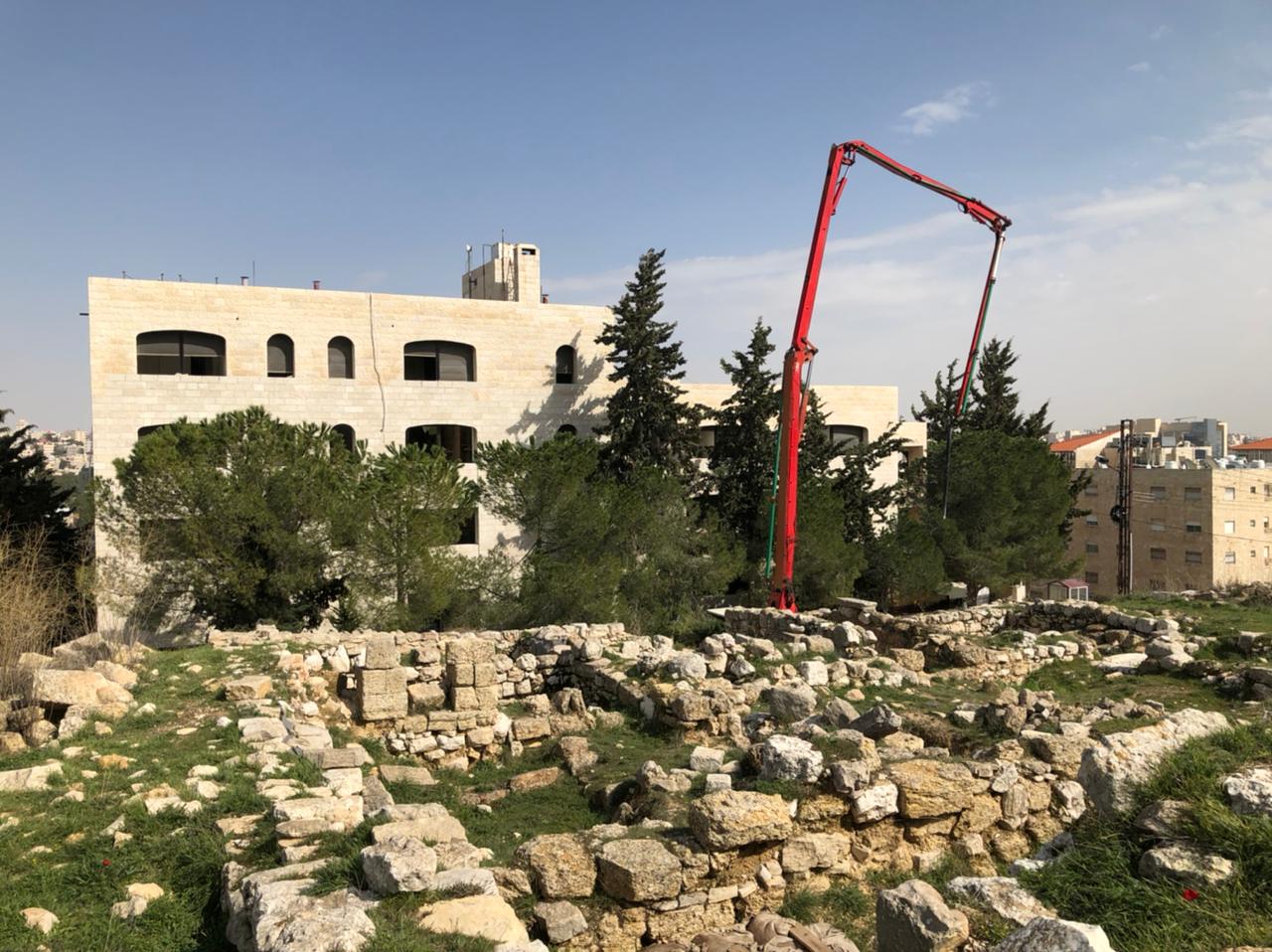 Partial walkthrough of 6th floor (March 3, 2021). Reinforcing the central stairwell (iron to soon be covered with cement) (March 3, 2021). Structural reinforcement in the form of a new ceiling beam (March 3, 2021). ACOR, view from the west, renovation equipment working on the building from the road in front. Khirbet Salameh in the foreground (February 23, 2021).