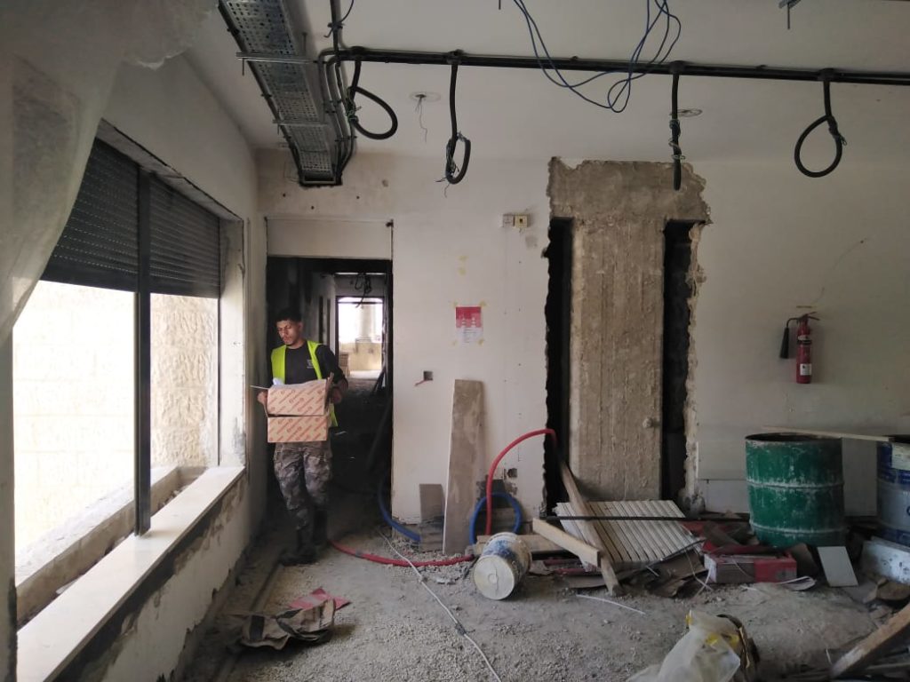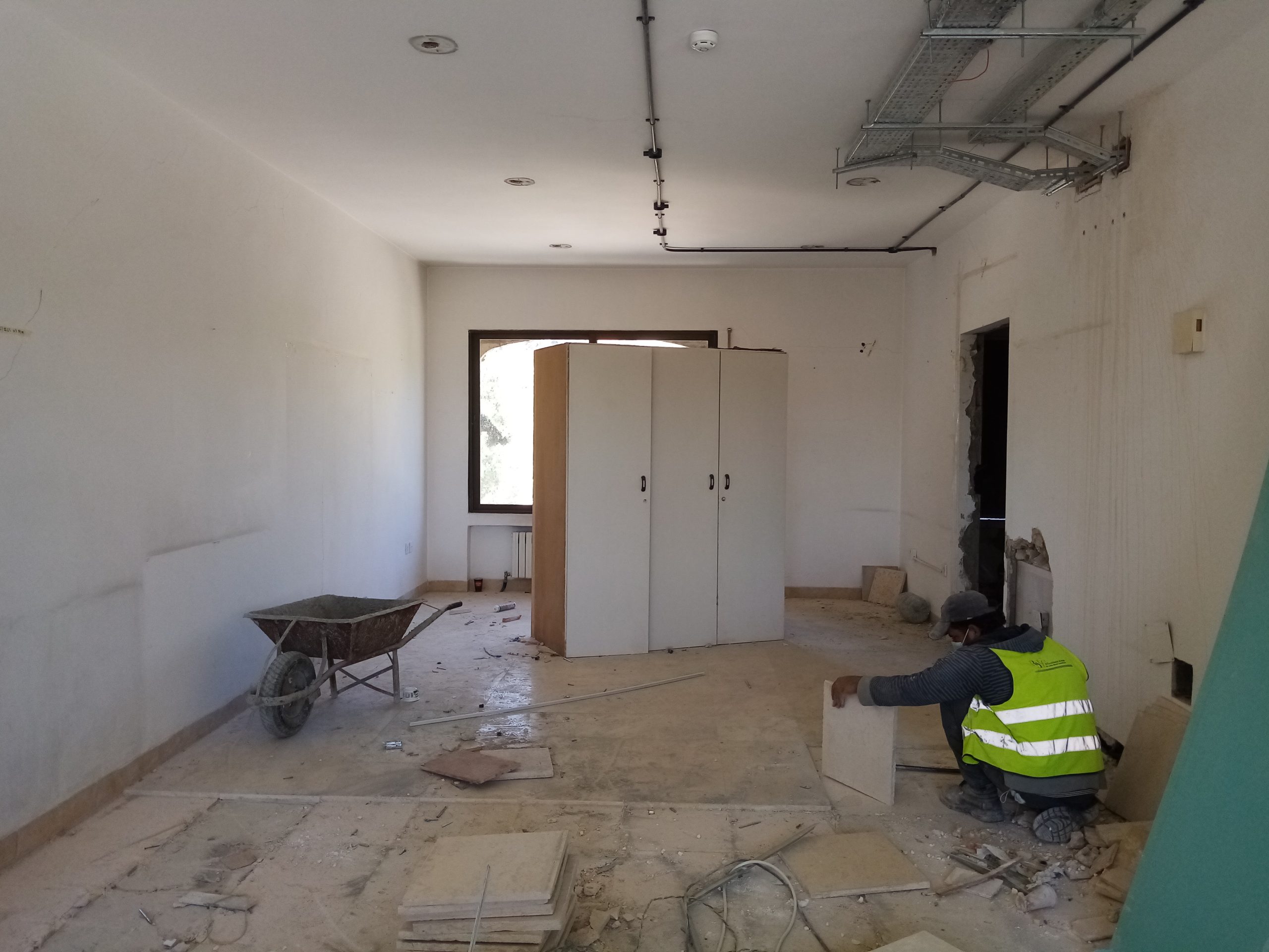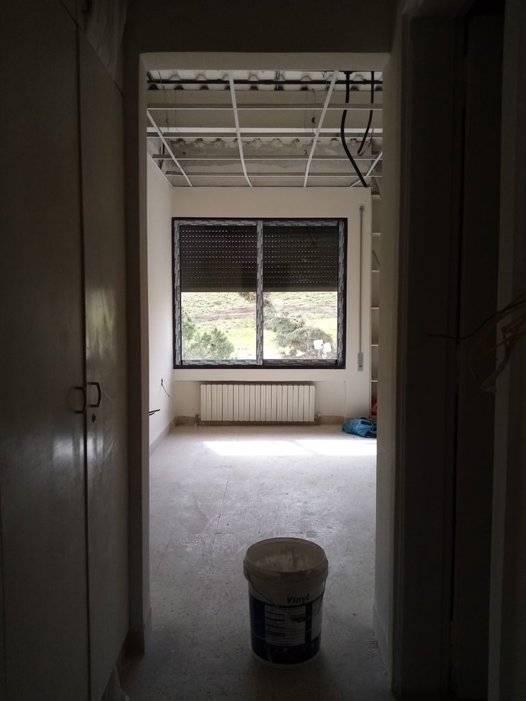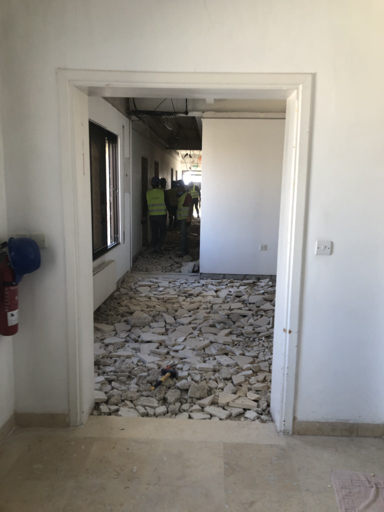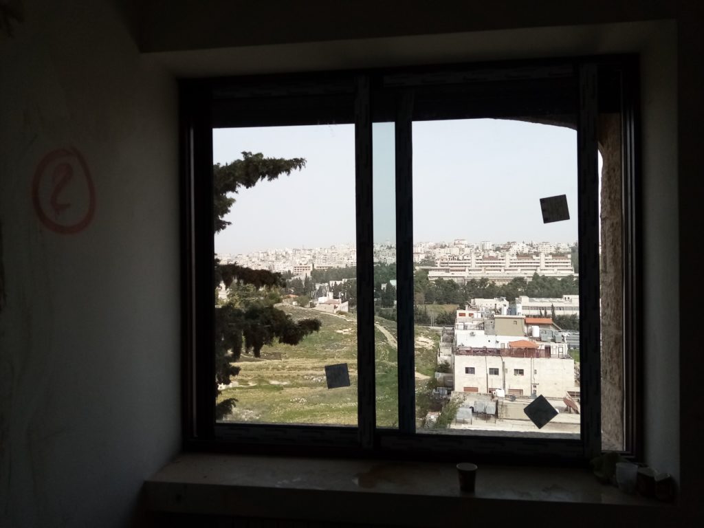 Renovated hostel rooms on the fifth floor (April 7, 2021). The 5th floor of the hostel, looking south (April 7, 2021).Fifth floor of the hostel, looking north (April 7, 2021).Completed sixth-floor office space (April 1, 2021). A completed sixth-floor apartment bathroom (April 1, 2021).Hallway of the nearly-complete sixth floor, which will soon serve as office space for ACOR staff during stage two of the renovation (March 28, 2021). The lower library, nearly free of books in preparation for the second stage of the renovation, which will address the bottom three floors of the building, including library spaces (March 28, 2021). Facility Manager Abed Adawi in a fourth floor apartment, still in progress (March 28, 2021).Newly-installed windows in fourth floor office (facing west) (March 11, 2021). Fourth floor apartment with new windows installed, looking east toward the University of Jordan campus (March 11, 2021).
