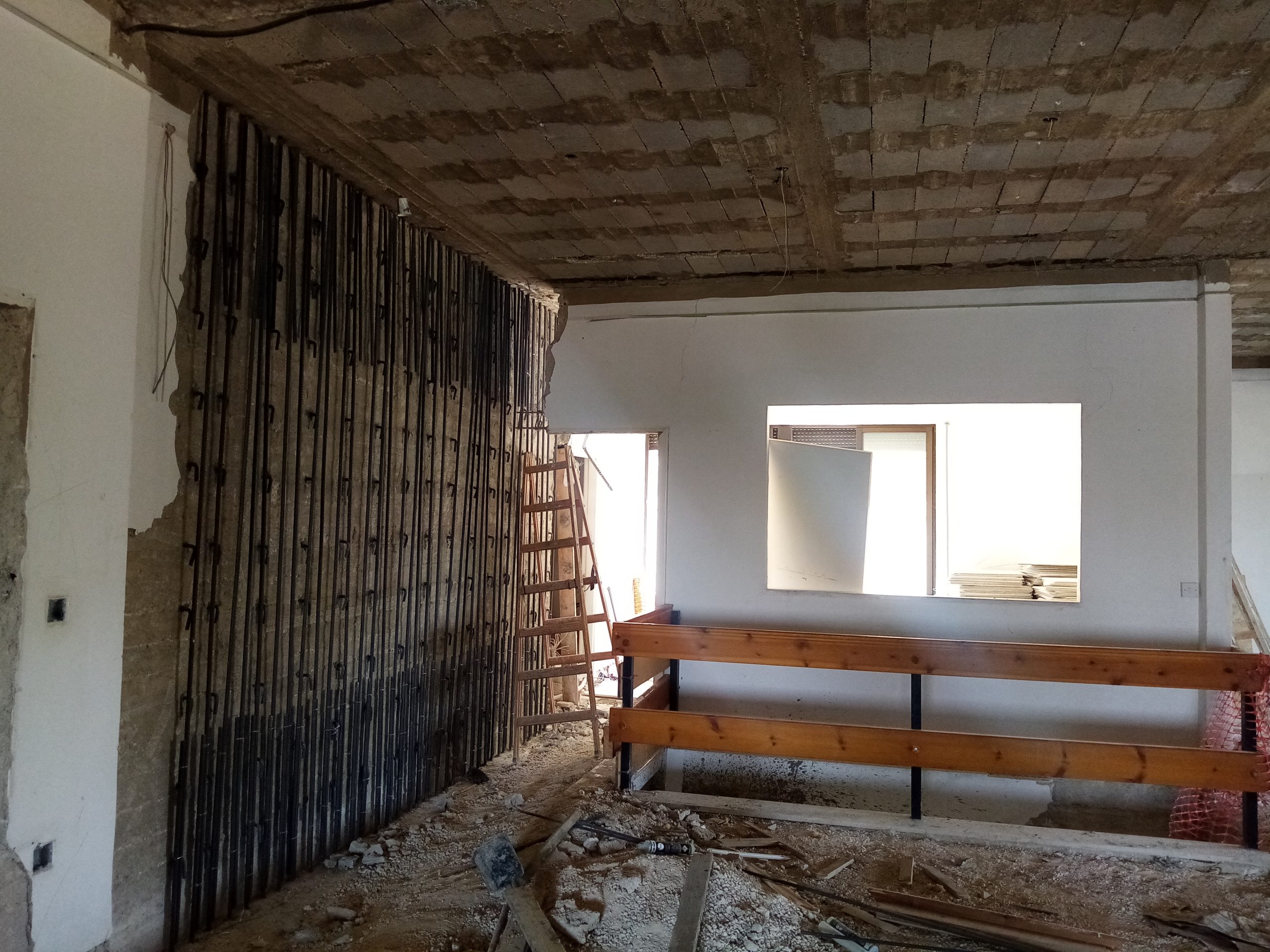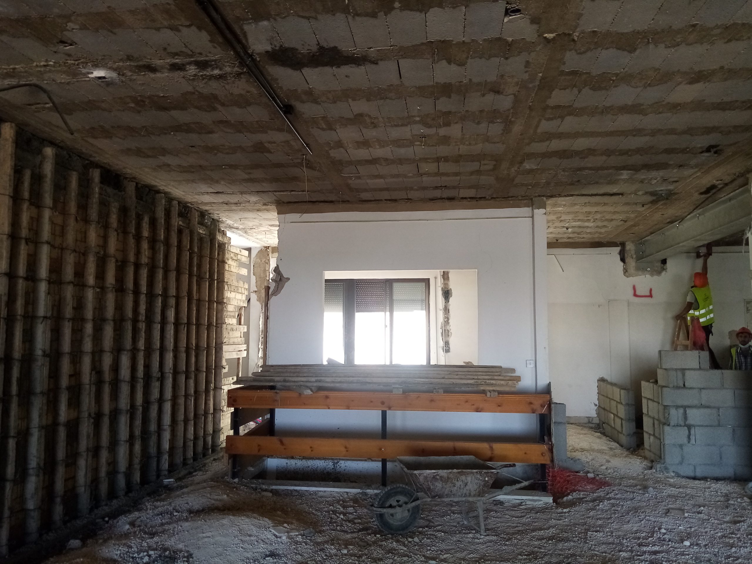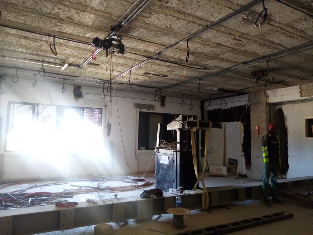 The current look through ACOR’s front entrance during the thick of renovations (sliding door at back leads to balcony area) (July 1, 2021). The second-floor seminar room under renovation, including preparation to install a new structural support beam (seen along bottom of image) (July 1, 2021).