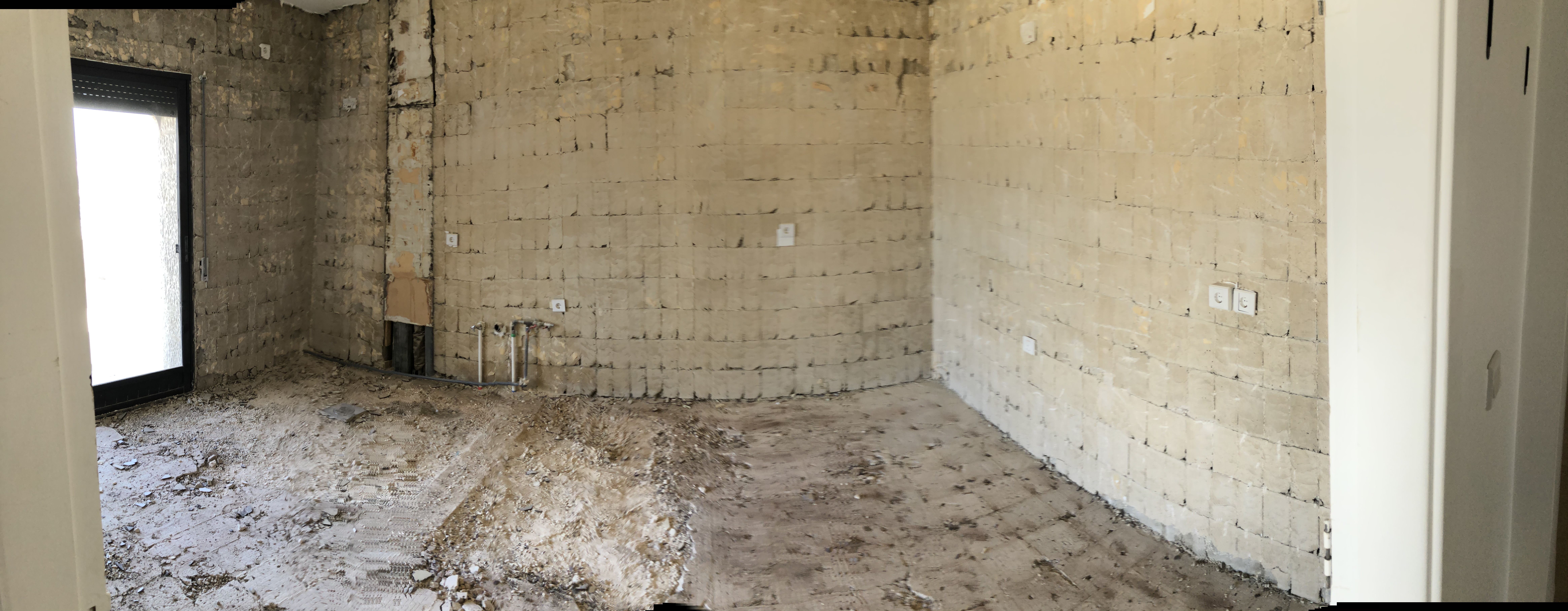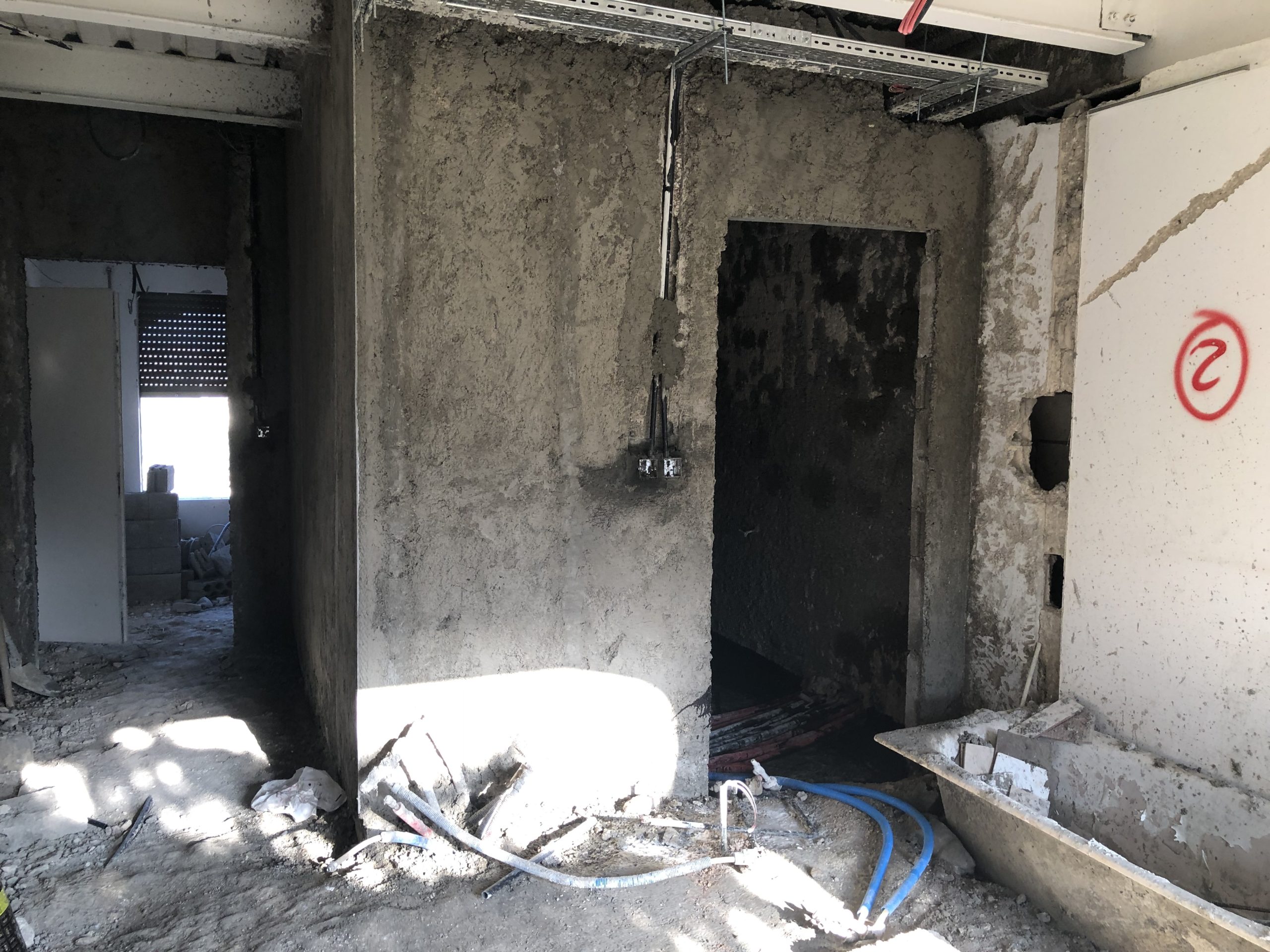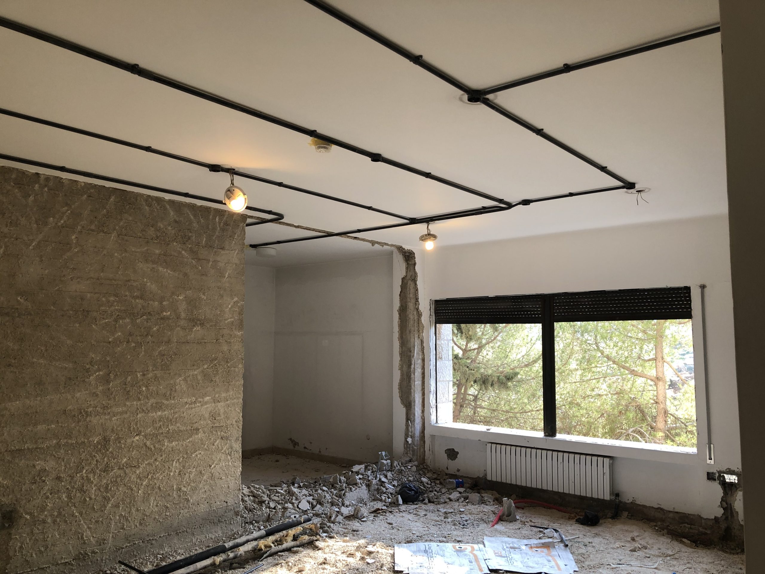 The current look through ACOR’s front entrance during the thick of renovations (sliding door at back leads to balcony area) (July 1, 2021). The second-floor seminar room under renovation, including preparation to install a new structural support beam (seen along bottom of image) (July 1, 2021).