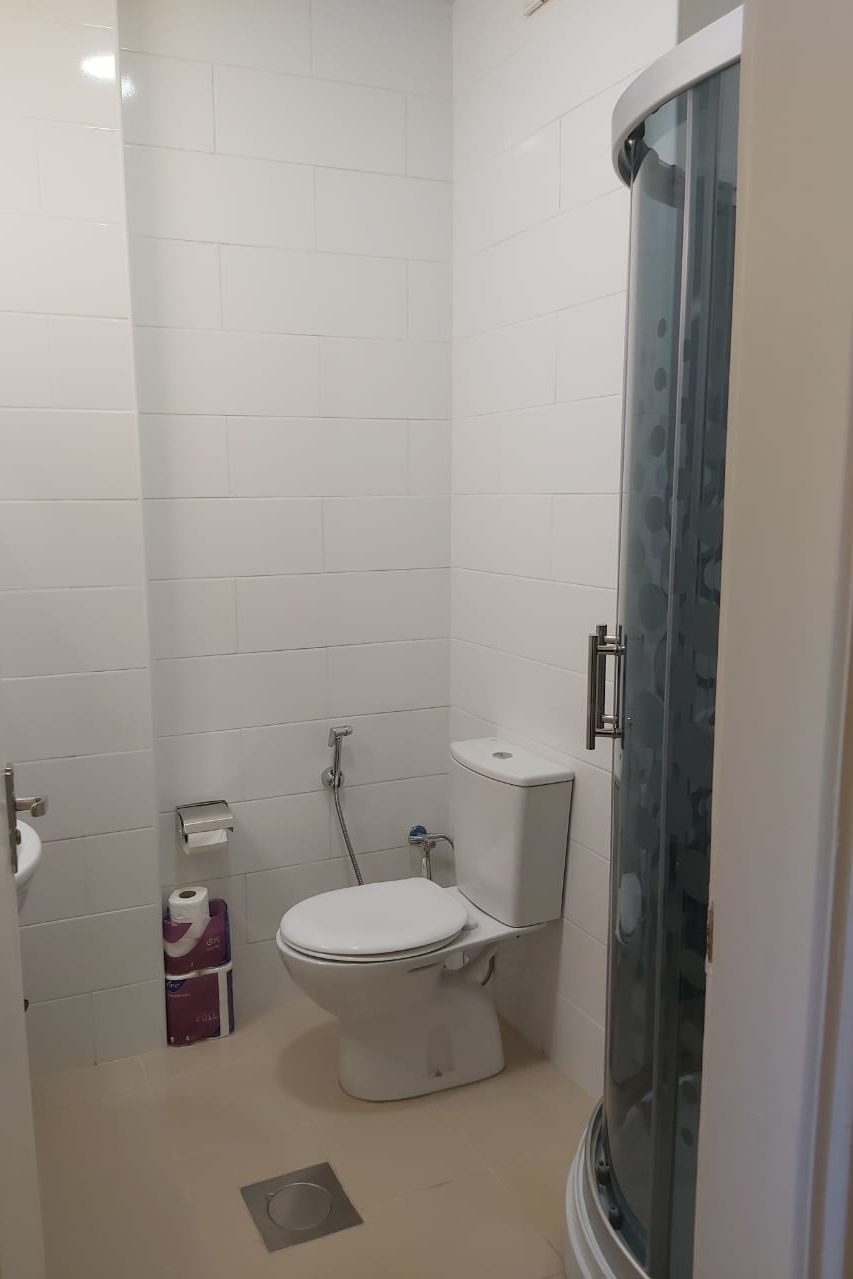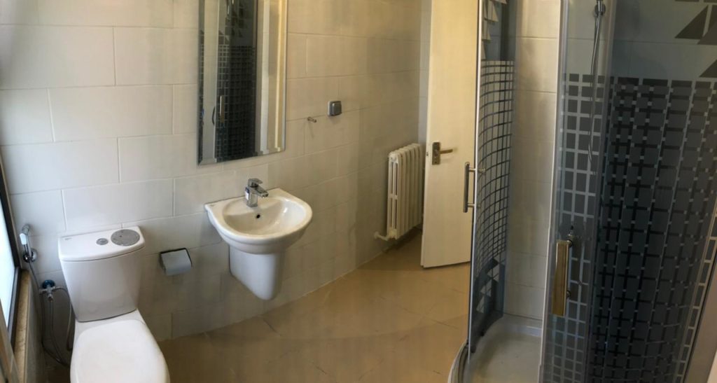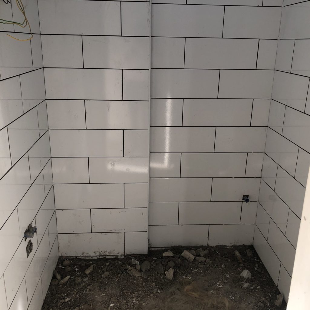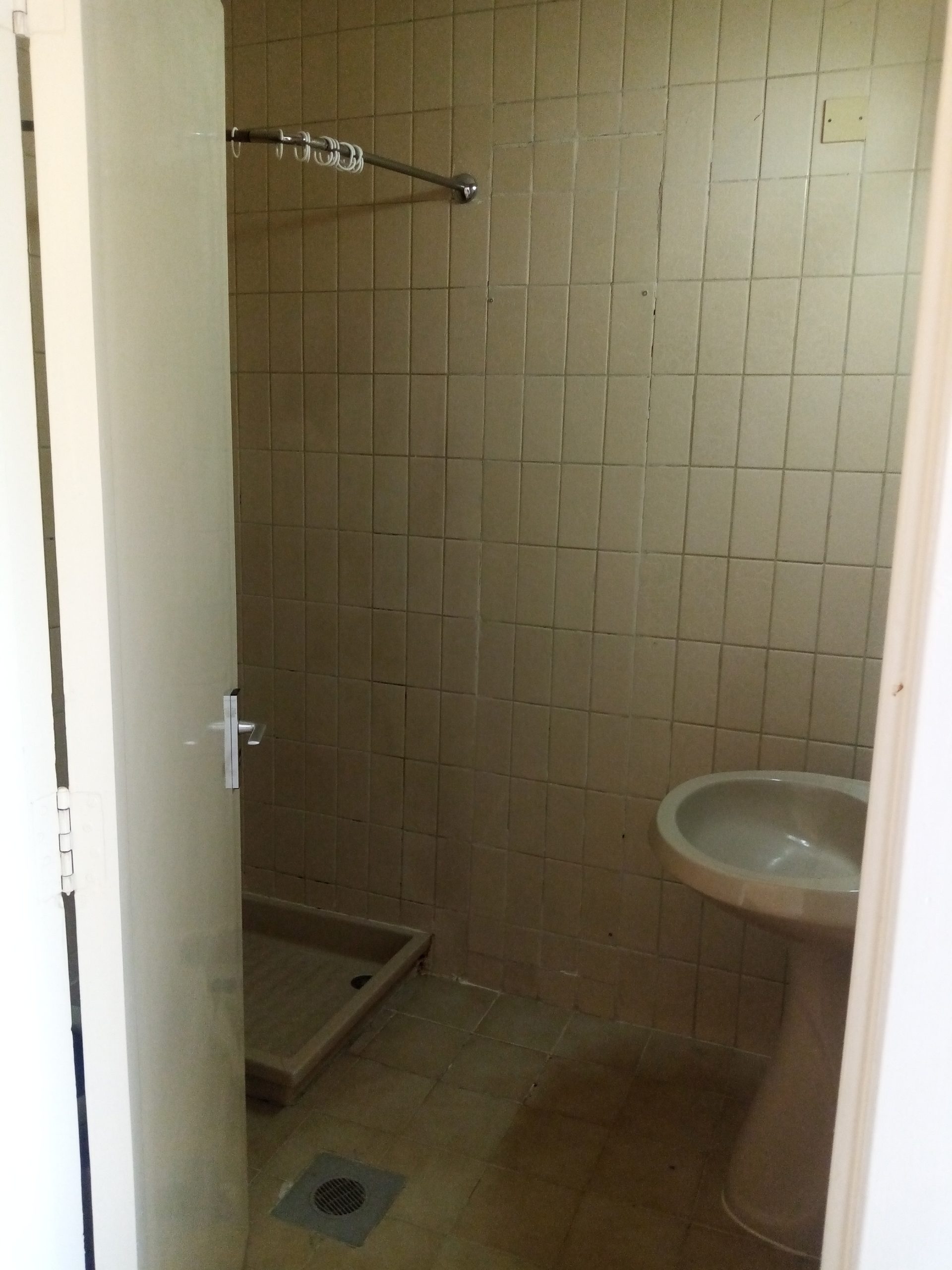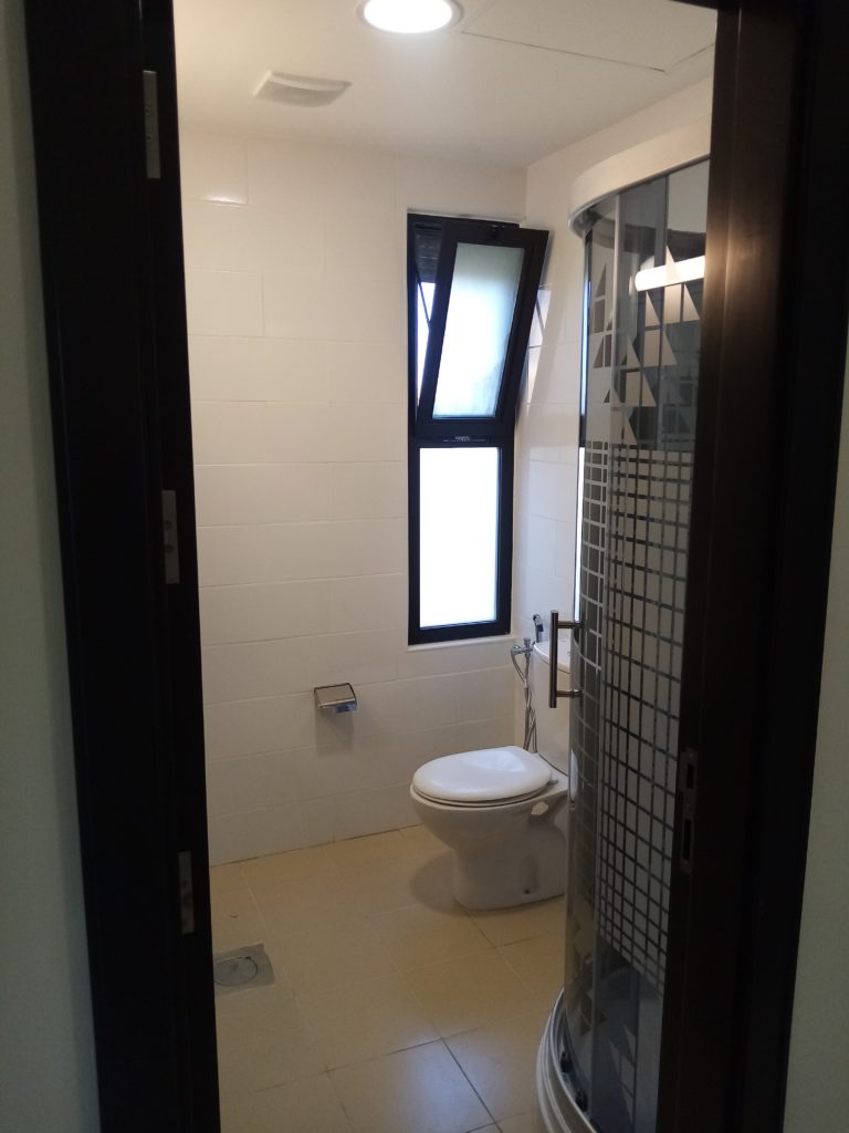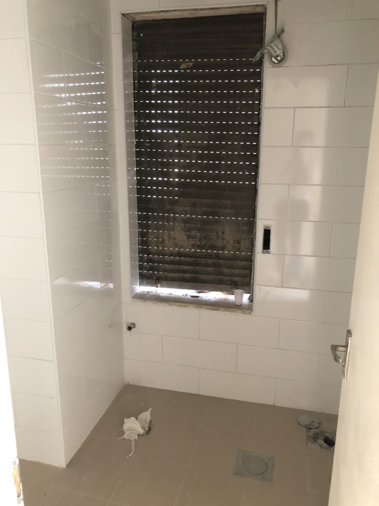 Renovated bathroom in unoccupied fifth-floor hostel room; new shower apparatus visible at right (May 27, 2021).