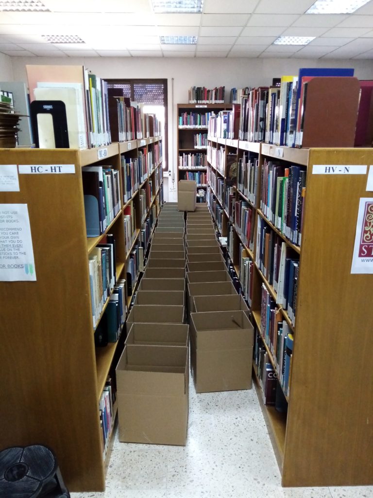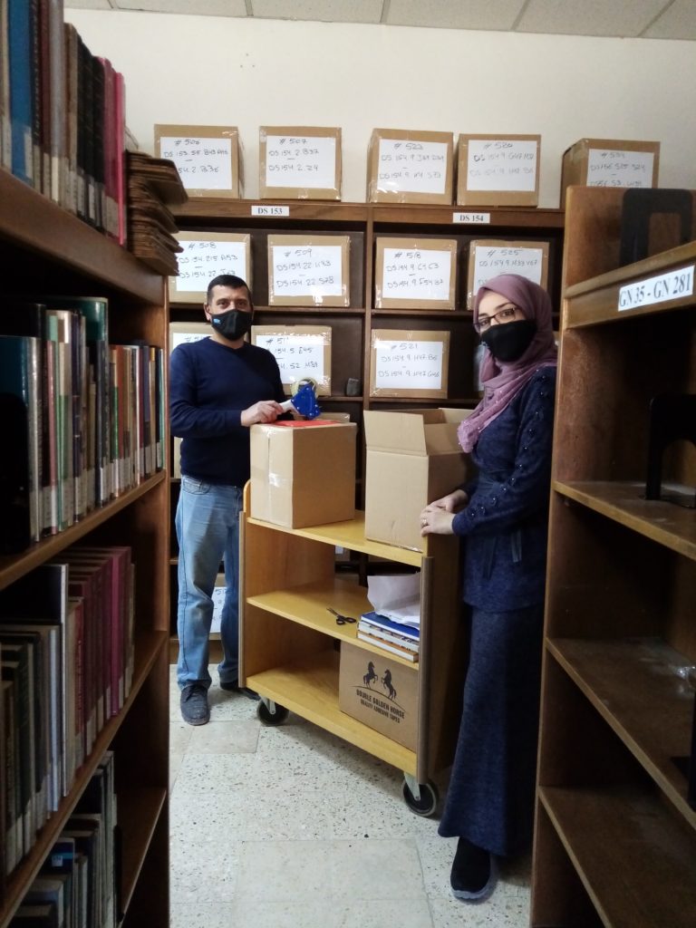 Facility Manager Abed Adawi (left) and Assistant Librarian Samya Khalaf Kafafi (right) preparing books for storage in the upper library (February 16, 2021).