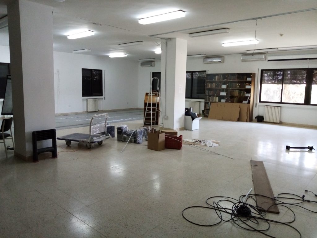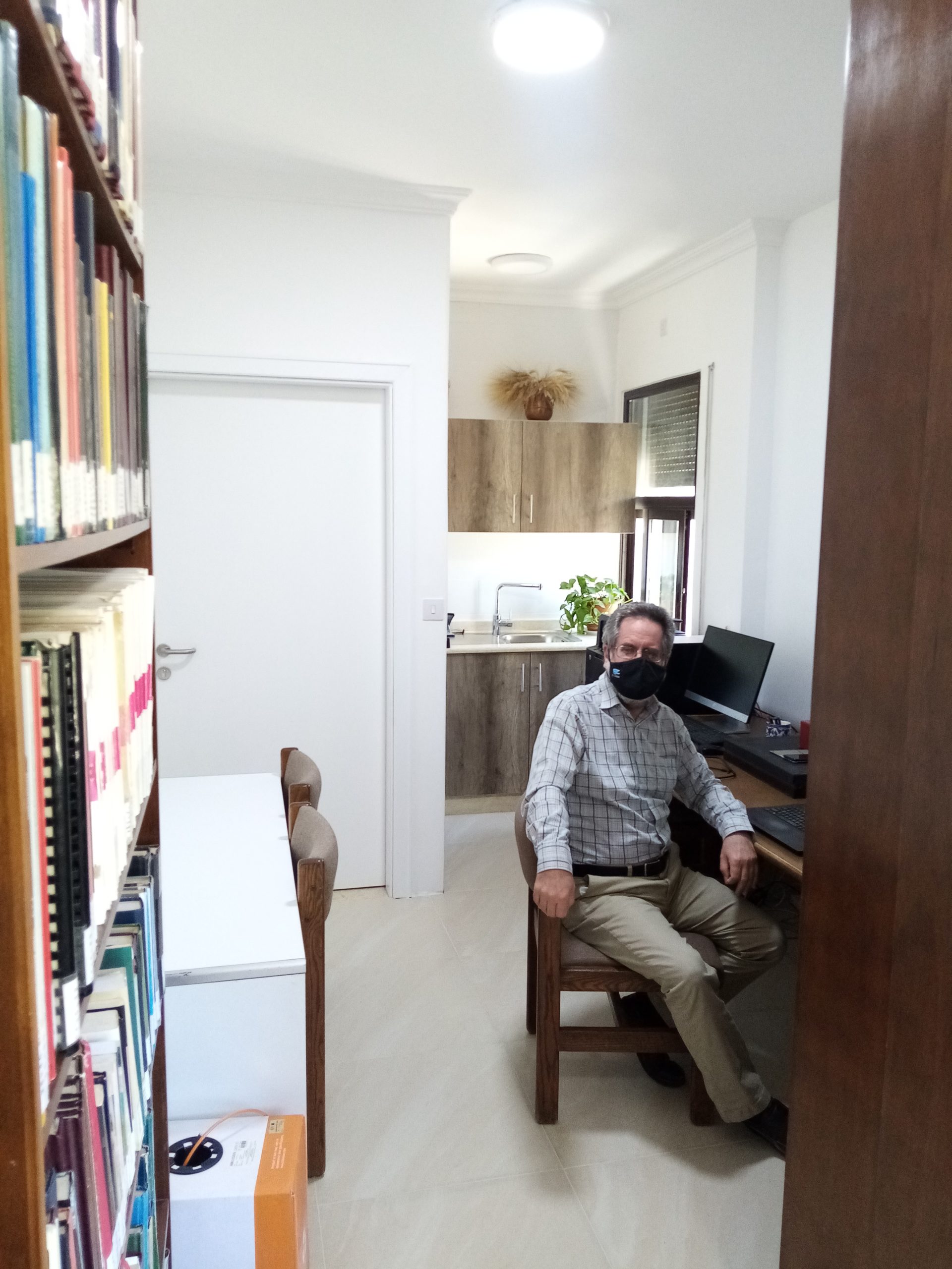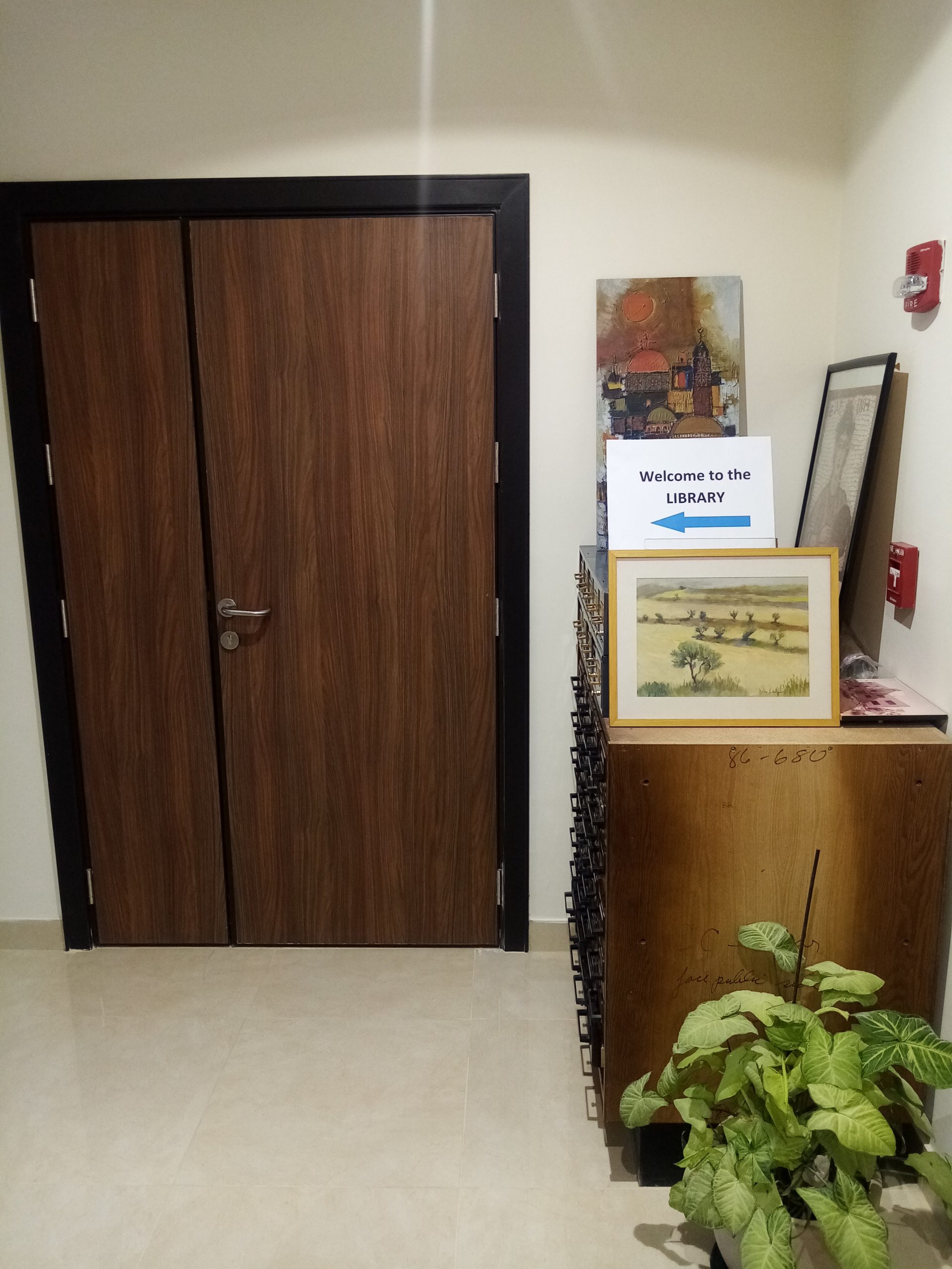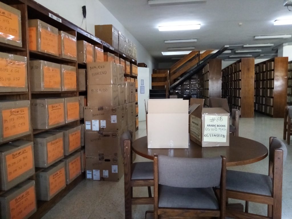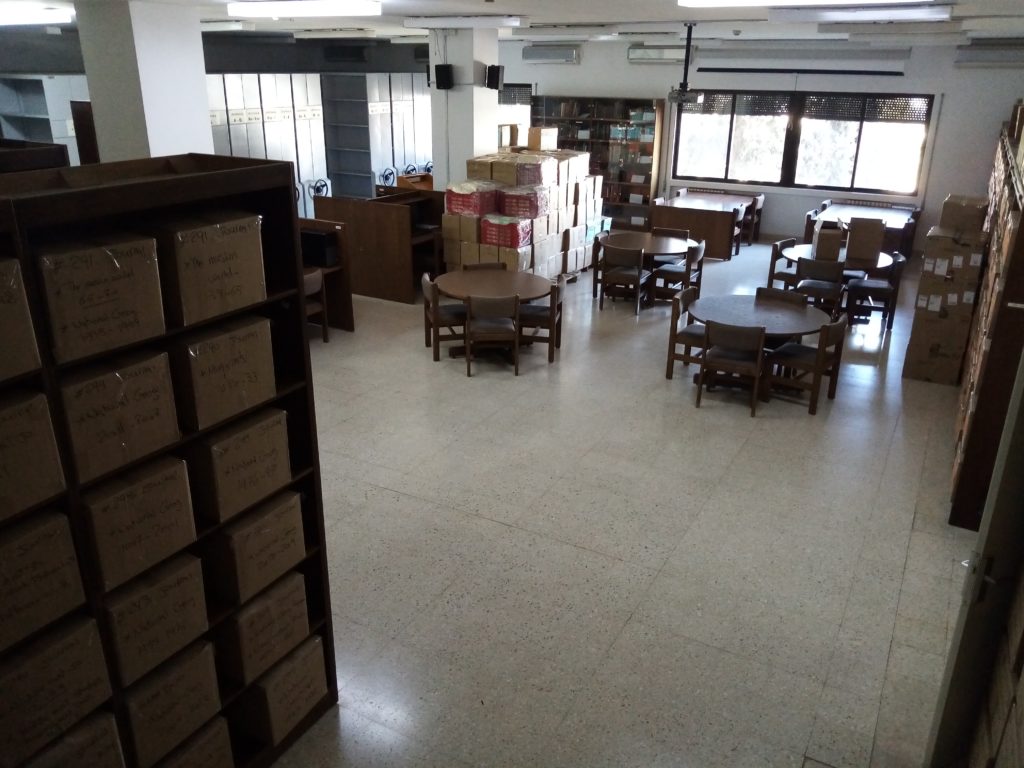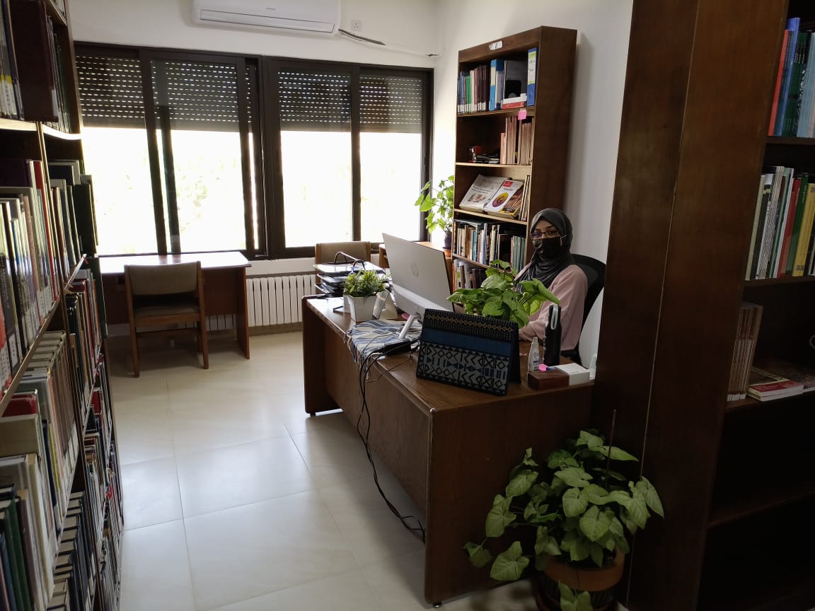 Our temporary library space, located on the already-renovated fifth floor, with assistant librarian Samya Khalaf Kafafi presiding (June 1, 2021).