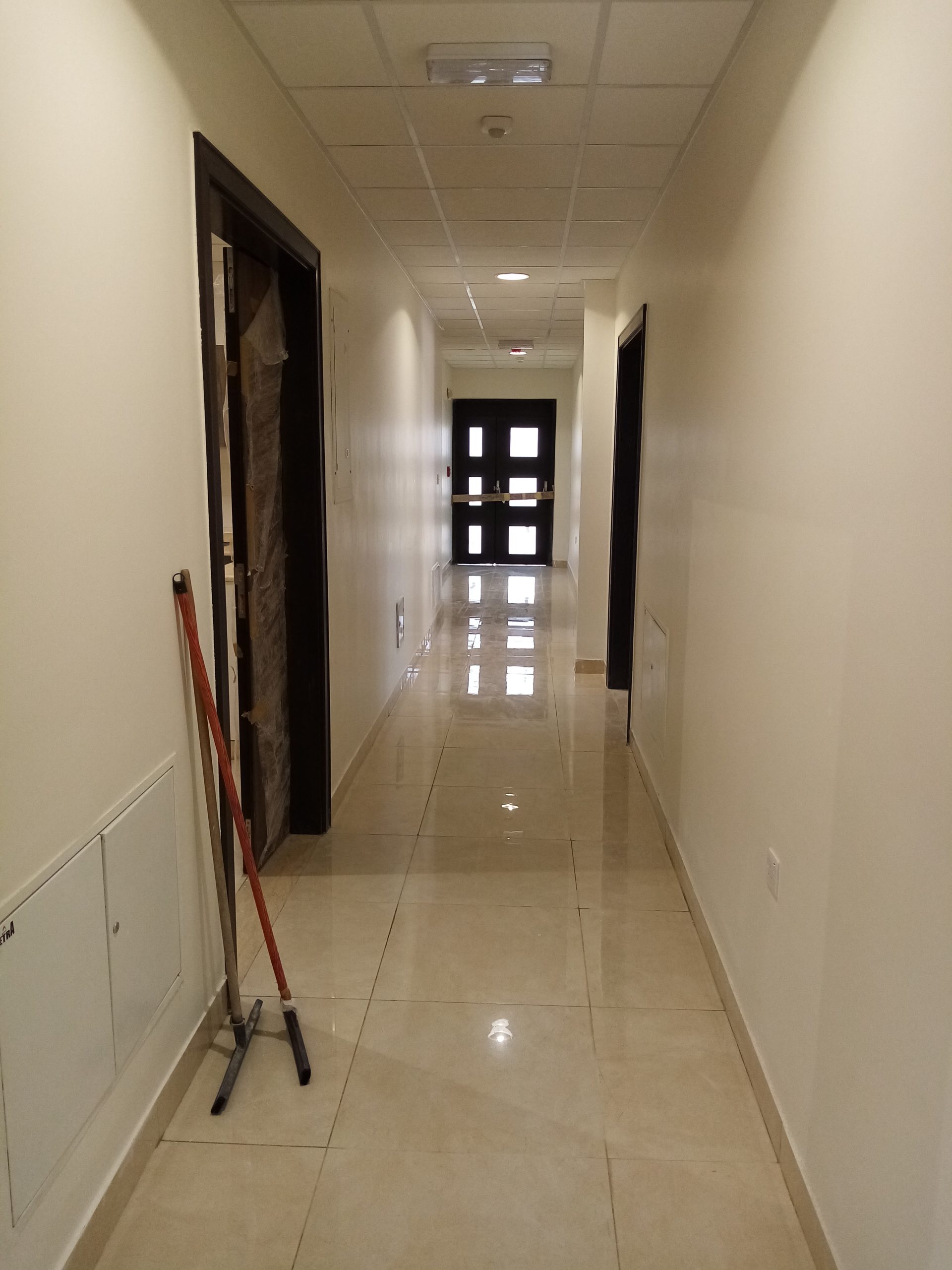 The southern half of the fourth-floor hallway, which leads to hostel rooms. This segment of the building is included in phase two of the renovation, with current residents now on a different floor, which was already completed in phase one (April 28, 2021).