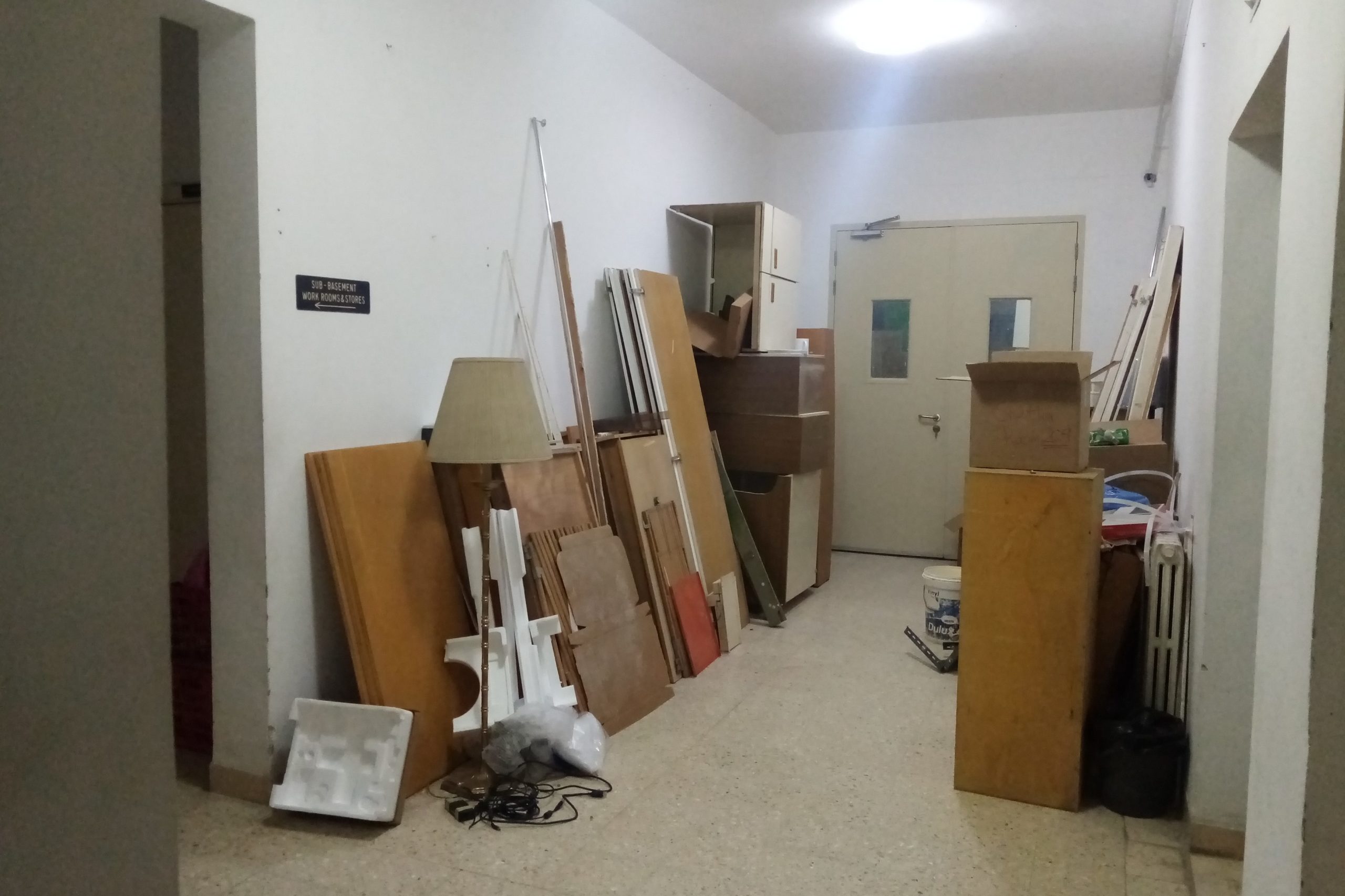 Renovation phase two begins in the lower library, with particular focus on adding structural support for this part of the building, which houses over 45,000 volumes (April 14, 2021). Items temporarily stored in the middle of clearing the 2nd floor (basement) for second phase of the renovation (April 7, 2021).