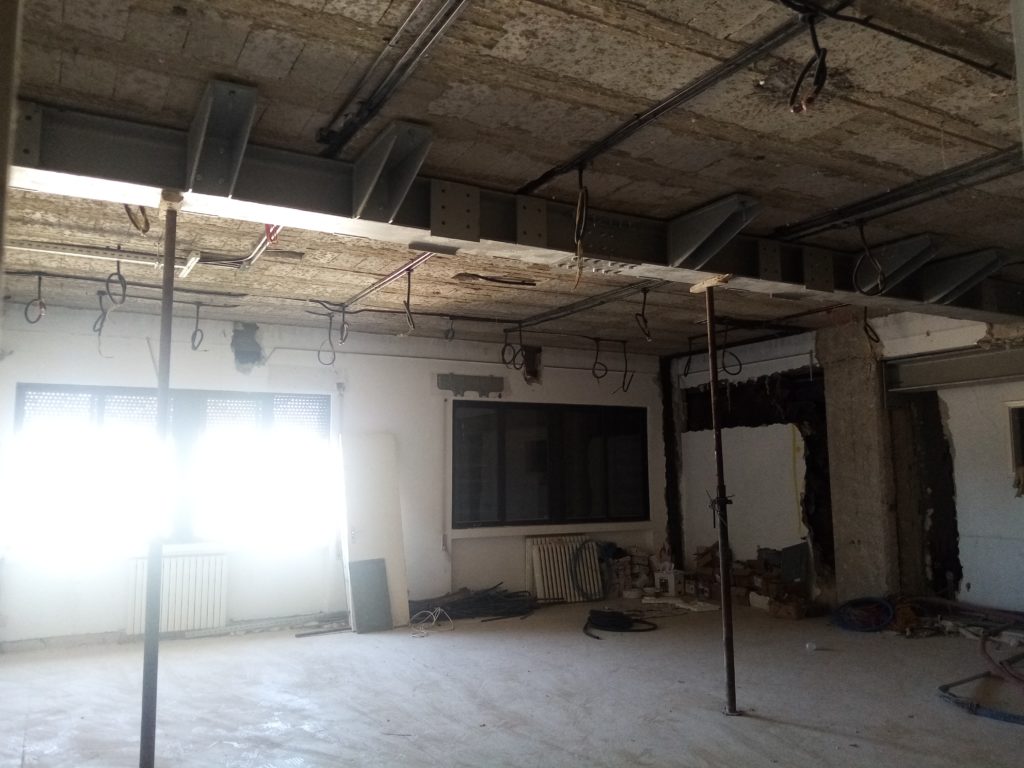 Offices by ACOR’s main entrance under renovation (third floor) (July 13, 2021).Structural supports added to the lower library (second floor) (July 13, 2021). Second-floor seminar room, now with structural beam installed (top) (July 13, 2021).