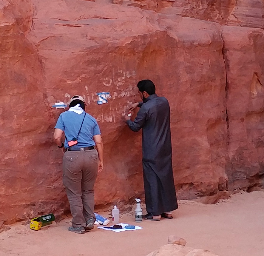 Mohammad Domayan and Dr. Niccole Cerveny removing latex paint vandalism in Khazali Canyon as part of a conservation workshop facilitated by the Community-Based Rock Art and Epigraphic Recording Program (CBRAER). Core team members participated in this workshop alongside graduates and local tour guides. Afterwards, graffiti removal kits were left with Wadi Rum Protected Area staff for continued use and basic conservation. (Photo by C. D. Allen.) Find out more here: https://publications.acorjordan.org/articles/wadi-rum-community-based-rock-art-and-epigraphic-recording-2018-2019/