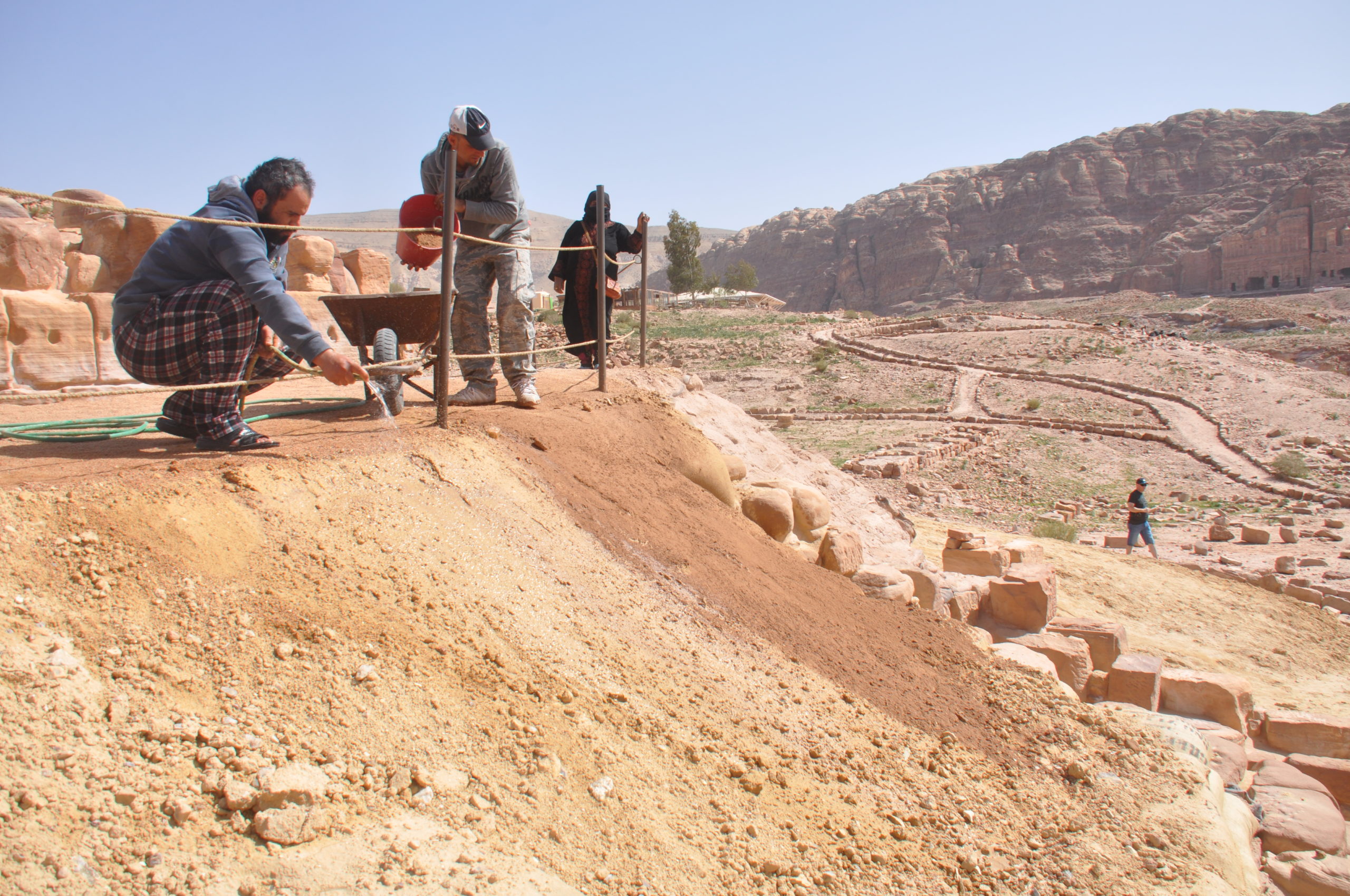 The Temple of the Winged Lions (TWL) is a large sacred complex in Petra with a grand entrance flanked by columns and with an inner cultic chamber featuring a raised podium. The site faces conservation challenges including drainage, monitoring of salts, stability, and long-term conservation and presentation. In 2018, Franco Sciorilli finalized conservation work in the inner sanctuary (cella), and TWL team members completed backfilling in the cella and in the southwest and southeast quadrants. This image from the TWL Cultural Resource Management initiative shows path build-out completed, with course sand added to the bank in front of the cella by team members Shaker AlFaqeer and Ahmad Mowasa and fence posts installed. Best practices for site conservation are still under development, in consultation with Petra community members, while fellows advance study of the site toward final publication, expected in 2022. (March 6, 2018. Photo by TWLCRM Initiative Team.) Find out more here: https://publications.acorjordan.org/articles/petra-temple-of-the-winged-lions-2018-2019/