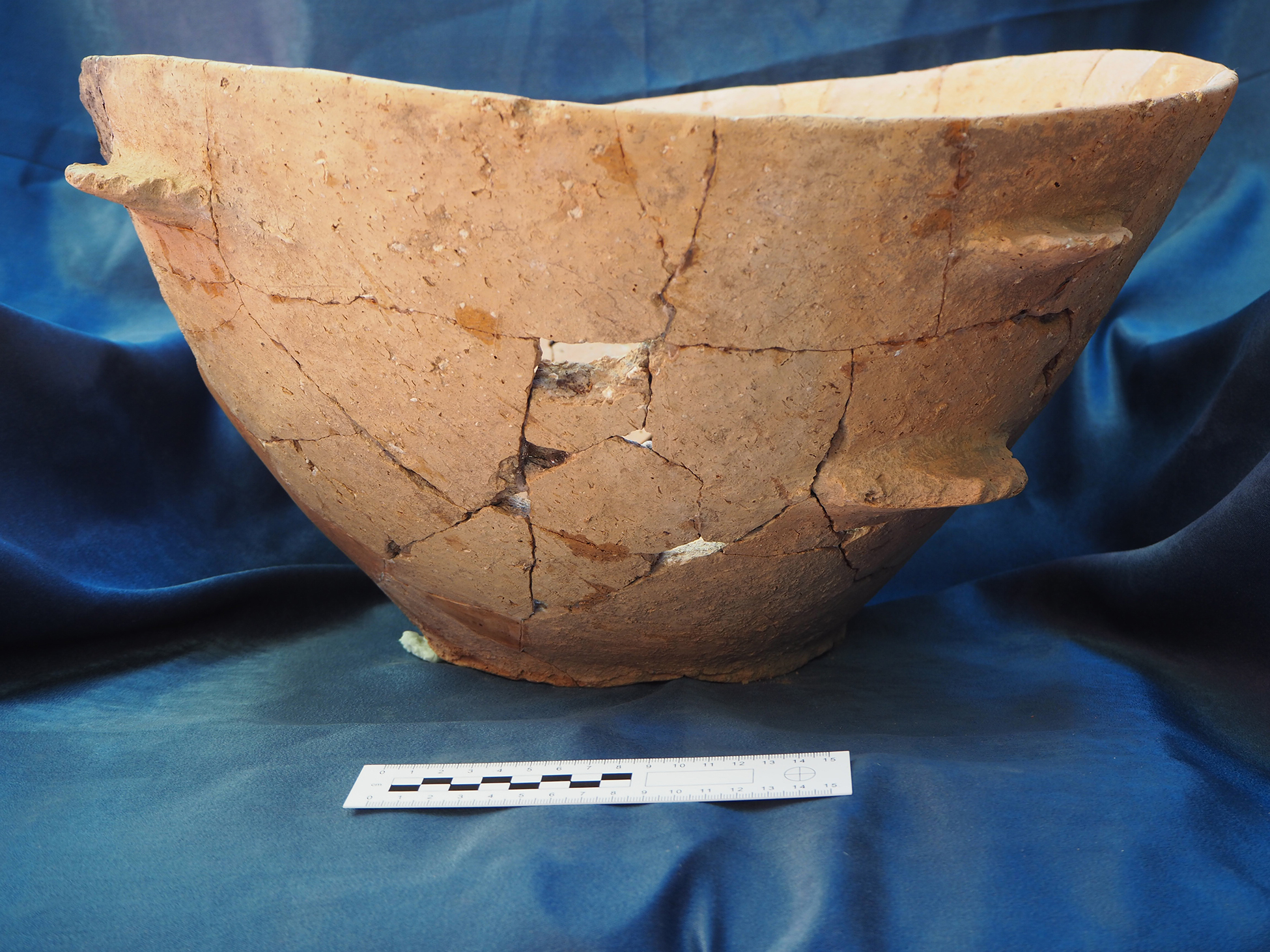 Surveys at the site of Murayghat continue partly as a rescue operation, as the construction of a road to the west of the site in 2018 led to the disturbance of several ancient remains. A number of nearly complete broken ceramic vessels, stone tools, and one possible bone tool were excavated from atop an earthen floor. This includes pottery dating to the Early Bronze Age Ia and showing unusual forms, such as the many-handled Murayghat bowl pictured here. The bowl was reconstructed through the ACOR Conservation Cooperative. Find out more here: https://publications.acorjordan.org/articles/murayghat-2018-2019/