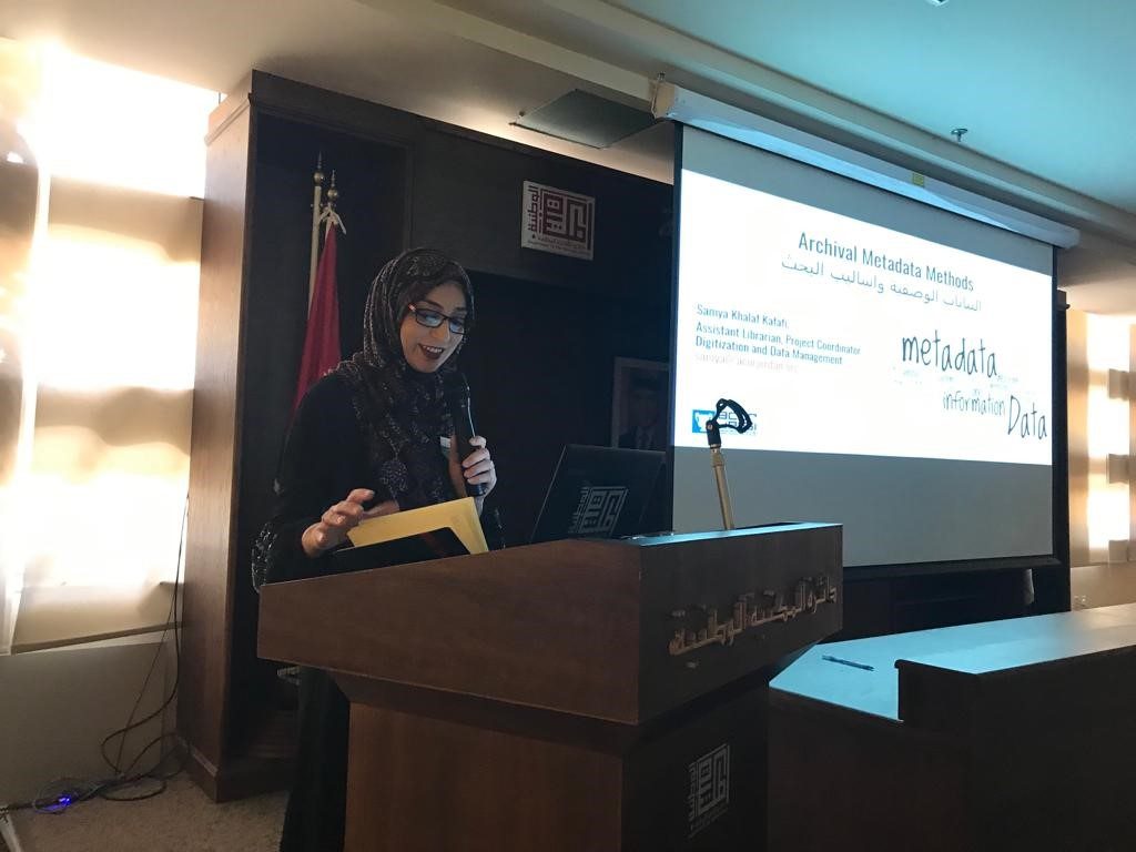 و اختتمت فعاليات اليوم الأول بورقة قدمتها سامية خلف كفافي مساعدة أمينة مكتبة أكور والمنسقة والمسؤولة عن البيانات في أرشيف أكور الالكتروني للصور والوثائق – حيث تحدّثت عن البيانات الوصّفية للمواد الأرشيفية وأساليب البحث والحقول التي تعتمد في الأرشفه تباعاً لمعايير دولية محددة، بالإضافة لذكر قائمة للمواقع الالكترونية والمراجع الورقية المستخدمة لتوثيق المعلومات وأسماء المواقع الأثرية باختلاف كتابتها بحيث تصبح مرجع رئيسي لأي أرشيف آخر يمكنه الإستفاده منه وخصوصا في حقل الآثار. أخيراً سلطت الضوء على أرشيف أكور وكيّفية إدخال البيانات فيه وشرحت عن كيفية استخدام قاعدة البيانات لتصل إلى الصور المطلوبة حيث يبلغ عدد الصور المتاحة حاليا على شبكة الإنترنت في أرشيف أكور ما يقارب 20.000 صورة من مختلف المناطق الأثرية في الأردن وخارج الأردن