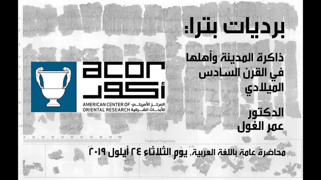 To see other ACOR lectures in English, please click here. (يوم الثلاثاء 24 أيلول 2019 الساعة 6 مساءً في المركز الأمريكي للأبحاث الشرقية (أكور برديات بترا: ذاكرة المدينة و أهلها في القرن السادس الميلادي في عام 1993 اكتُشف أرشيف من البرديات اليونانية في الكنيسة البيزنطية ببترا، يتضمن 140 بردية تقريبًا، مؤرخة في القرن السادس الميلادي،