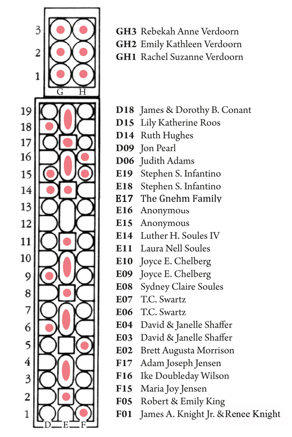 These mosaic tiles have been “adopted” by private donors. In the North Aisle, donors generously contributed $1000 per medallion to conserve the unique mosaic designs. To read more about the many people who have donated to this campaign (often making their contributions in honor of loved ones), please see below.