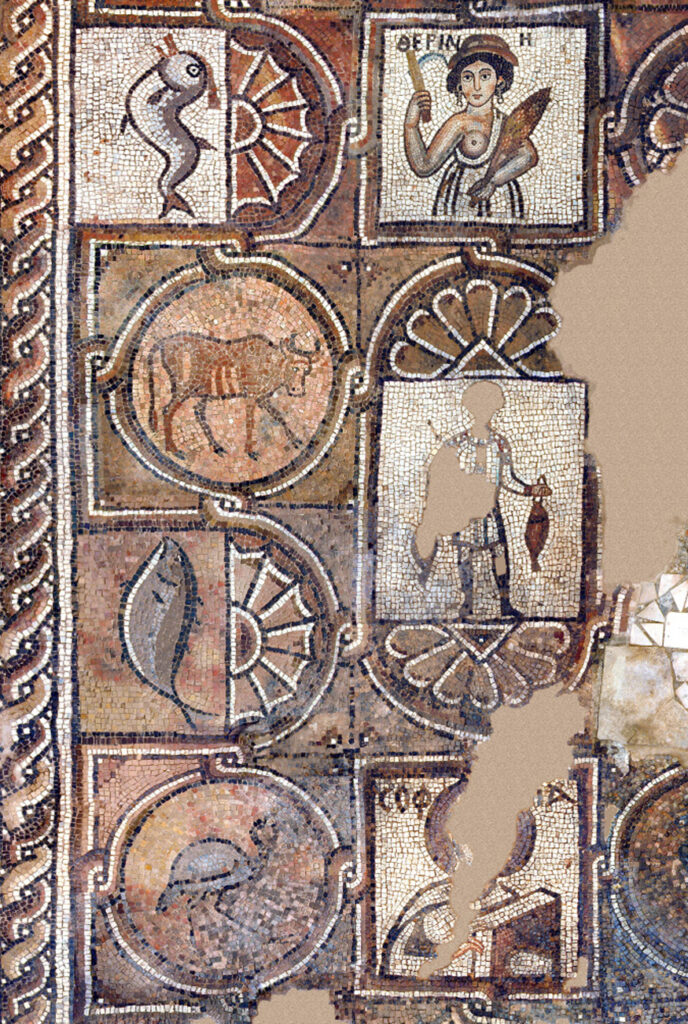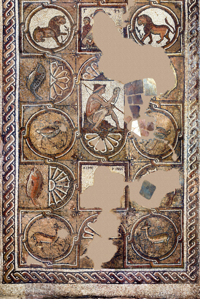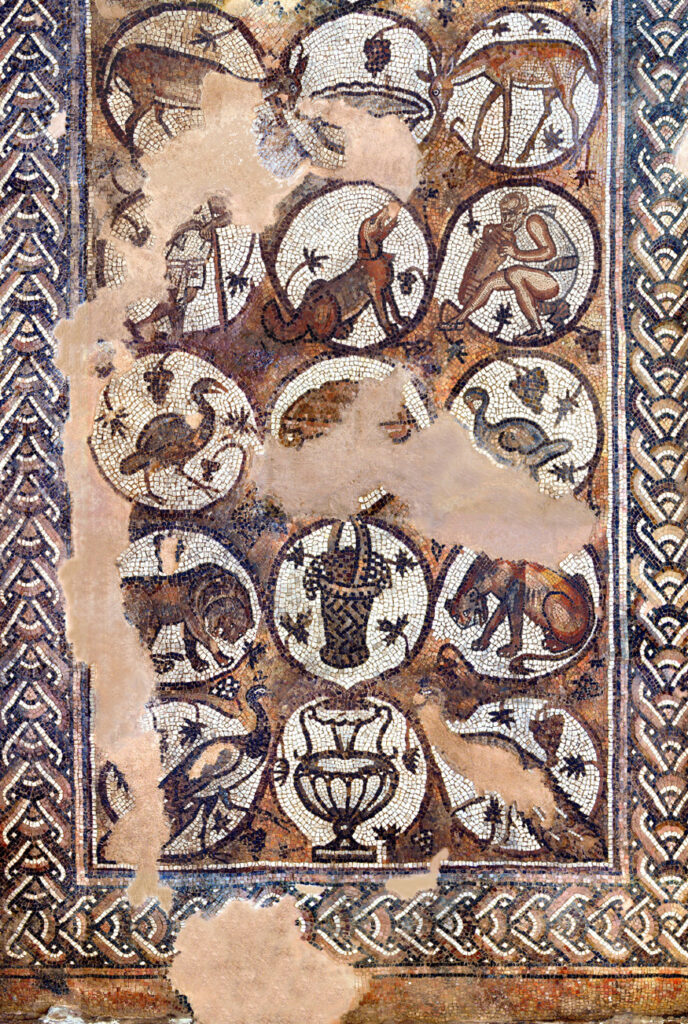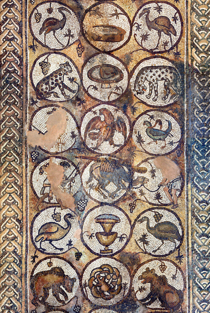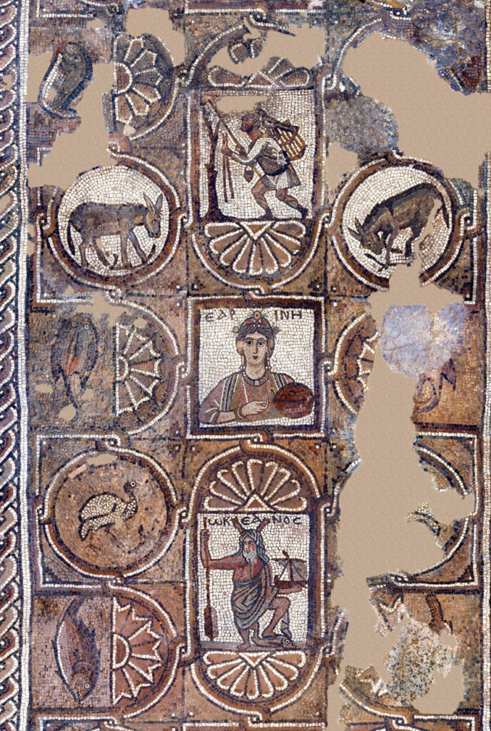 Most of the south aisle is occupied by the Mosaic of the Seasons— so called due to the four figures in the central column. Greek inscriptions identify these panels as personifications of the Seasons.