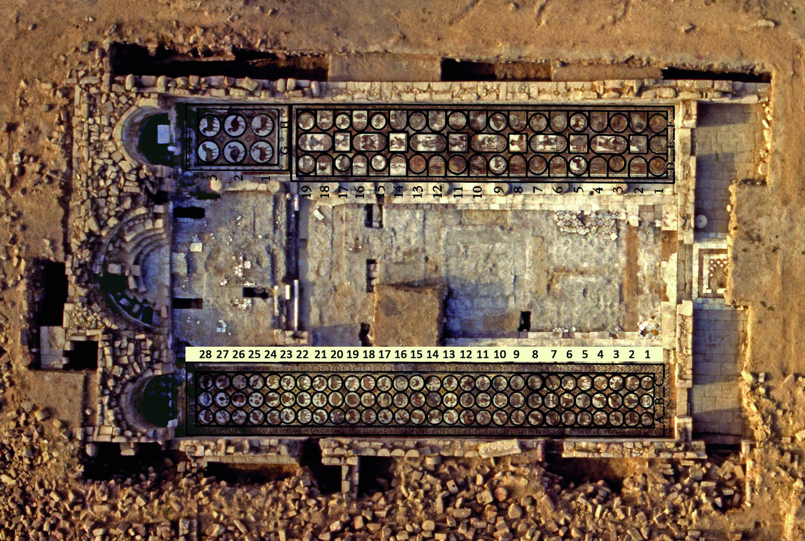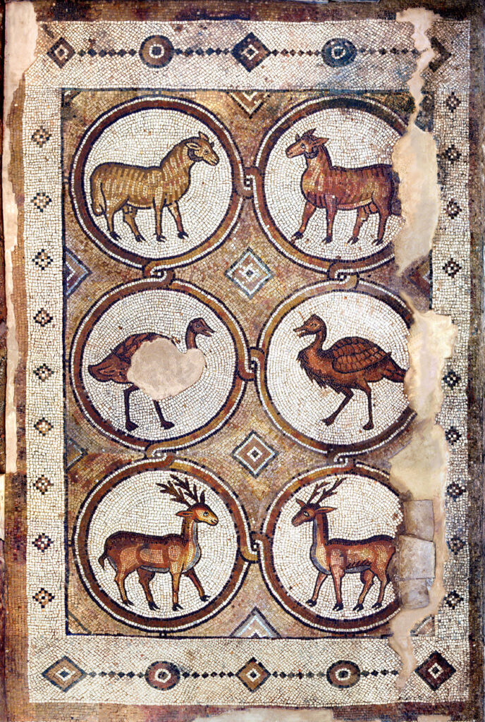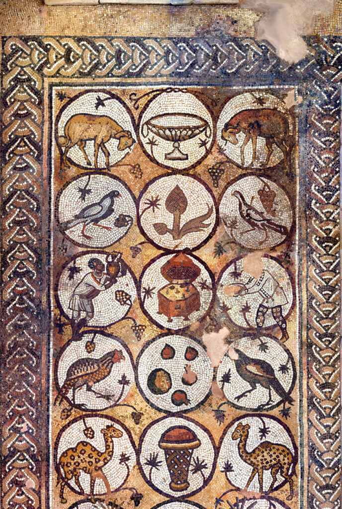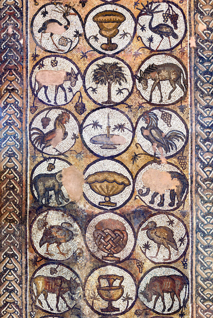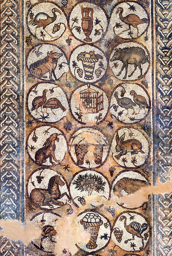 Most of the south aisle is occupied by the Mosaic of the Seasons— so called due to the four figures in the central column. Greek inscriptions identify these panels as personifications of the Seasons.